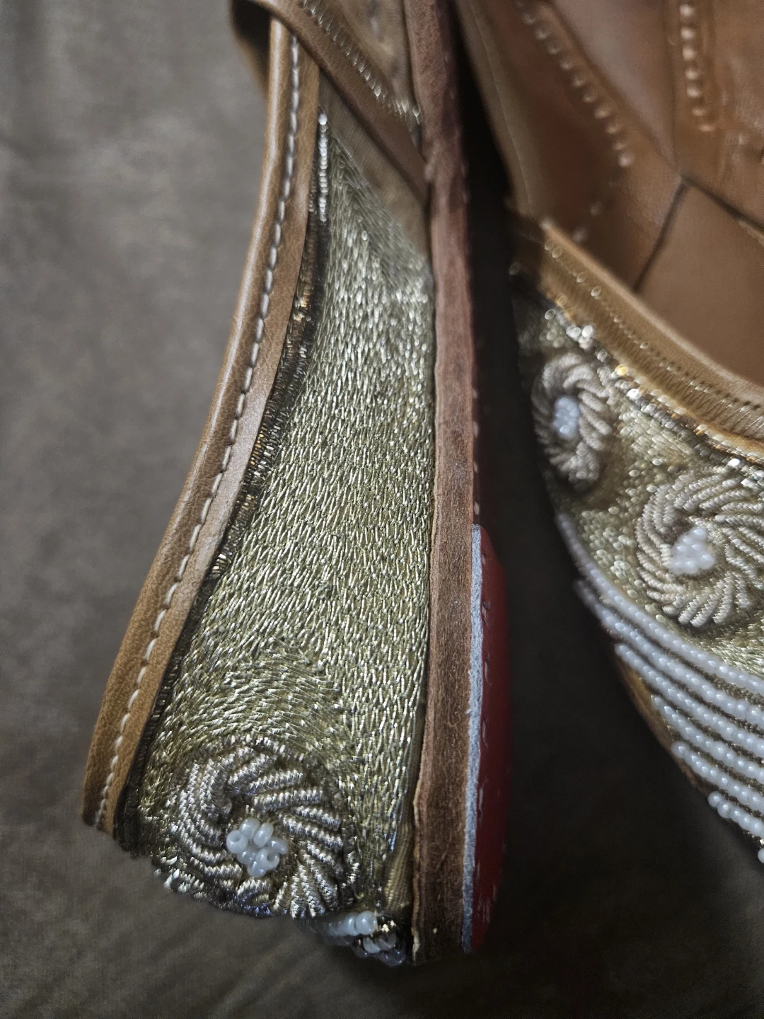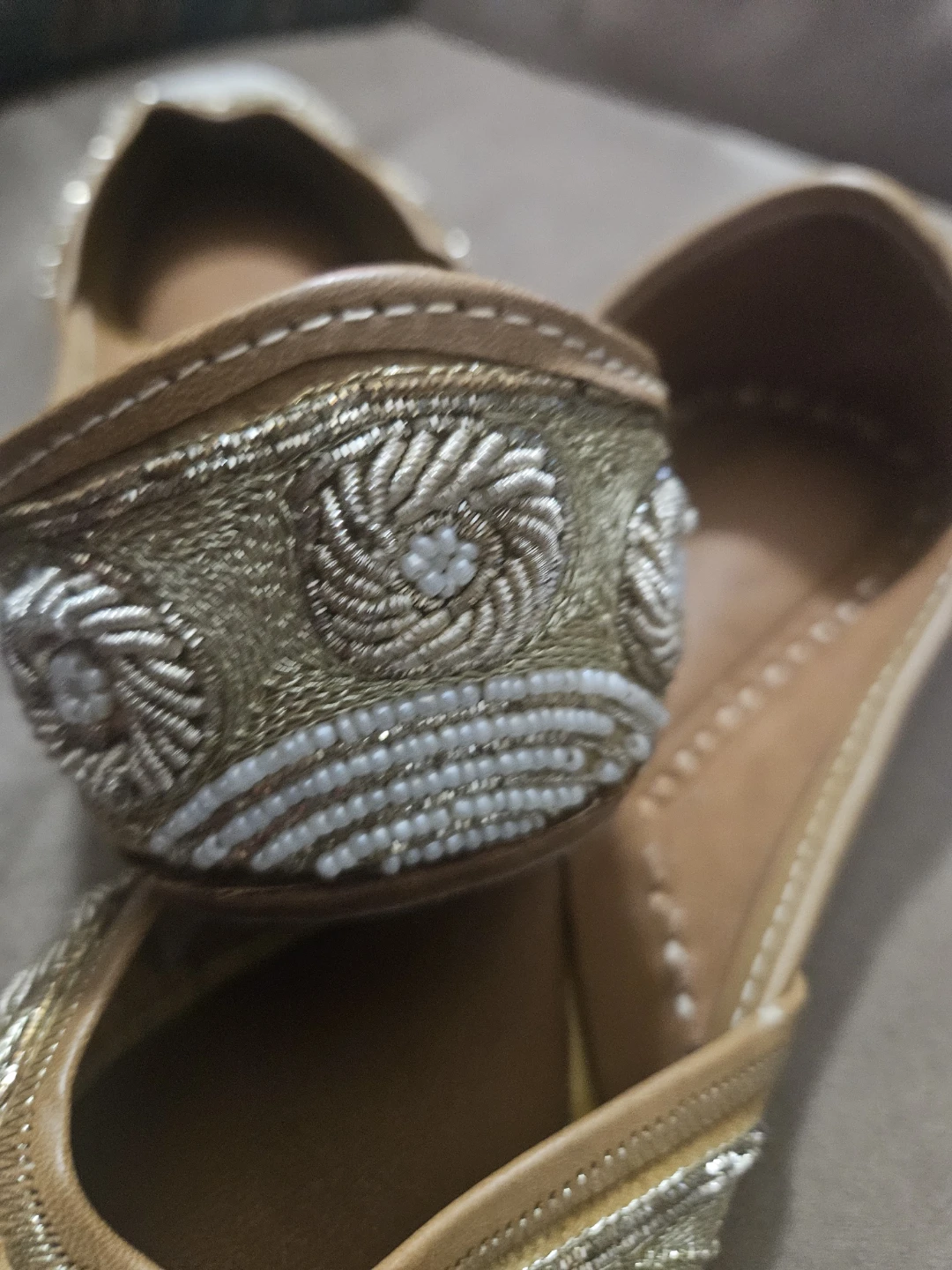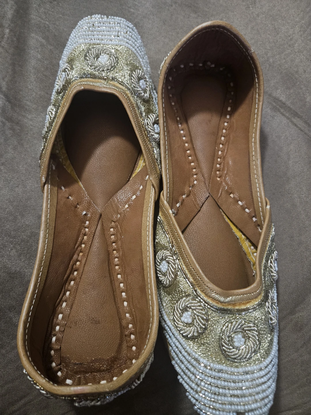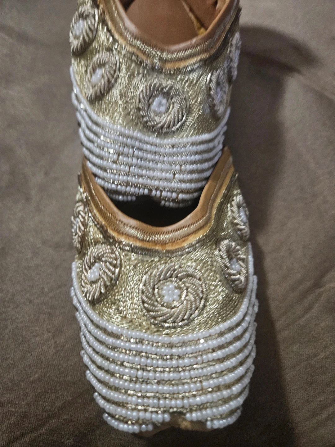 These are a pair of beautiful, embroidered jutti shoes! They are a size 6 and feature intricate embroidery and beadwork in gold and white. Perfect for adding a touch of elegance to any outfit