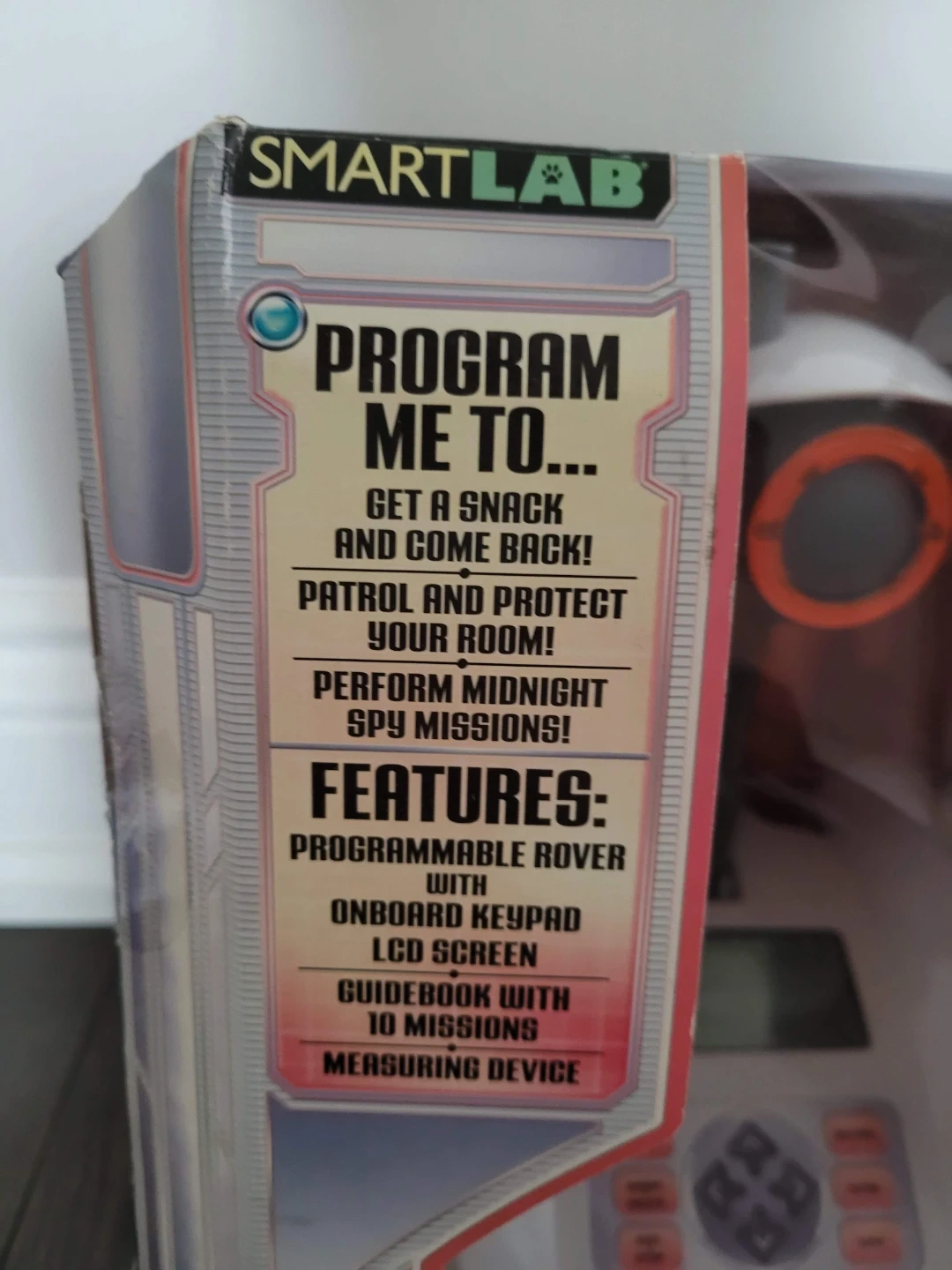 Selling a SmartLab Recon 6.0 Programmable Rover! It's a programmable rover with an onboard keypad and LCD screen. It also comes with a guidebook with 10 missions and a measuring device. Get ready to patrol and protect your room and perform midnight spy missions!