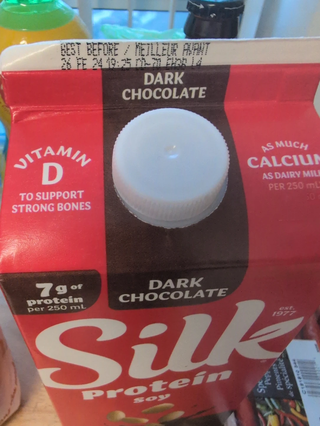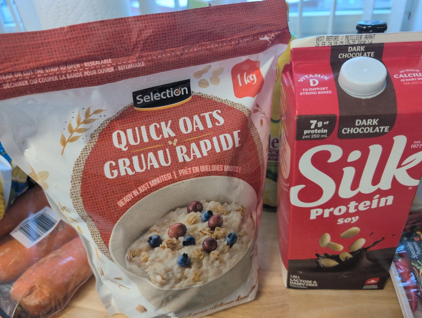 Selling a bag of Selection Quick Oats and a carton of Silk Dark Chocolate Soy Protein Milk. The Silk milk has Vitamin D to support strong bones and 7g of protein per 250ml (best before 24 February 2026)