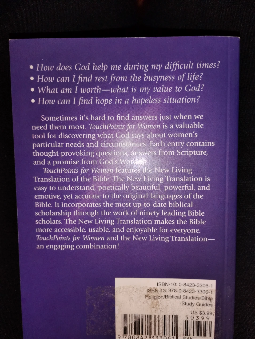 Selling a copy of TouchPoints for Women. It's a valuable tool for discovering what God says about women's particular needs and circumstances. Each entry contains thought-provoking questions, answers from Scripture, and a promise from God's Word. The New Living Translation is easy to understand, poetically beautiful, powerful, and emotive, yet accurate to the original languages of the Bible