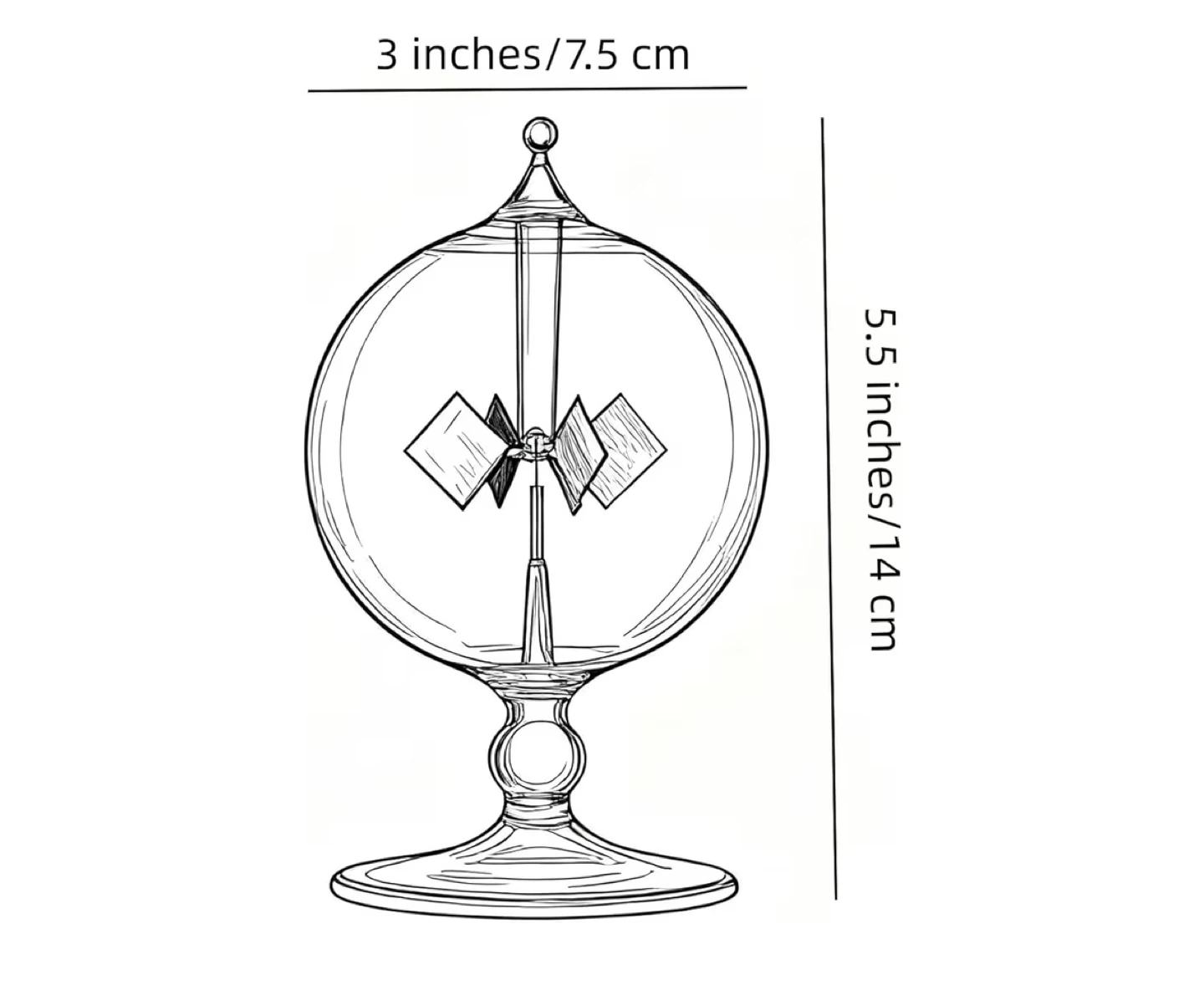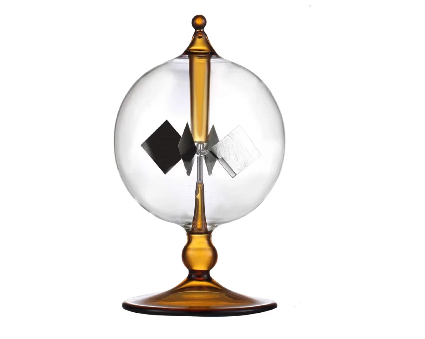 How it works - The glass Radiometer is made of a vacuum glass bulb. There is a rotating shaft and four blades inside. When it is exposed to sunlight, artificial light, or infrared radiation, its leaves will rotate. The stronger the light, the faster it rotates.