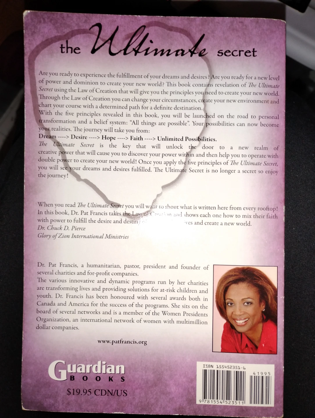 Selling "The Ultimate Secret" by Pat Francis. It's a book focused on keys to seeing your dreams and desires fulfilled. A self-help book to help you discover your power within and help you to operate with double power to fulfill the desire and destiny