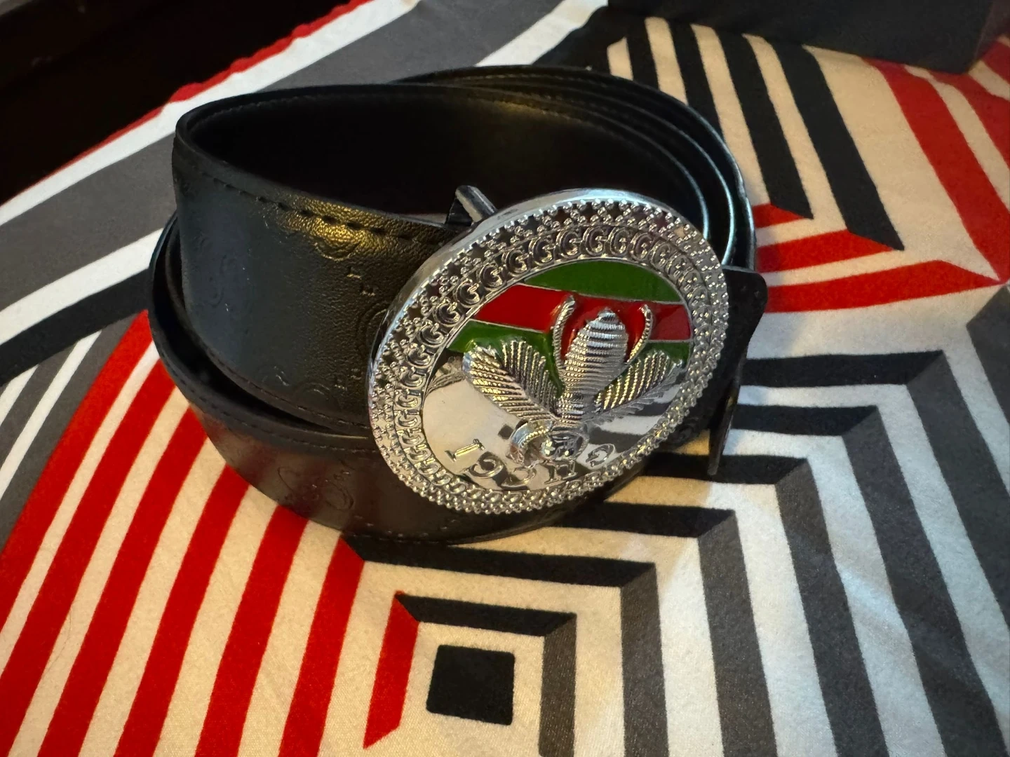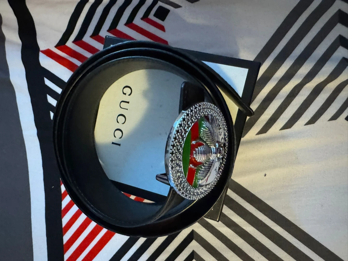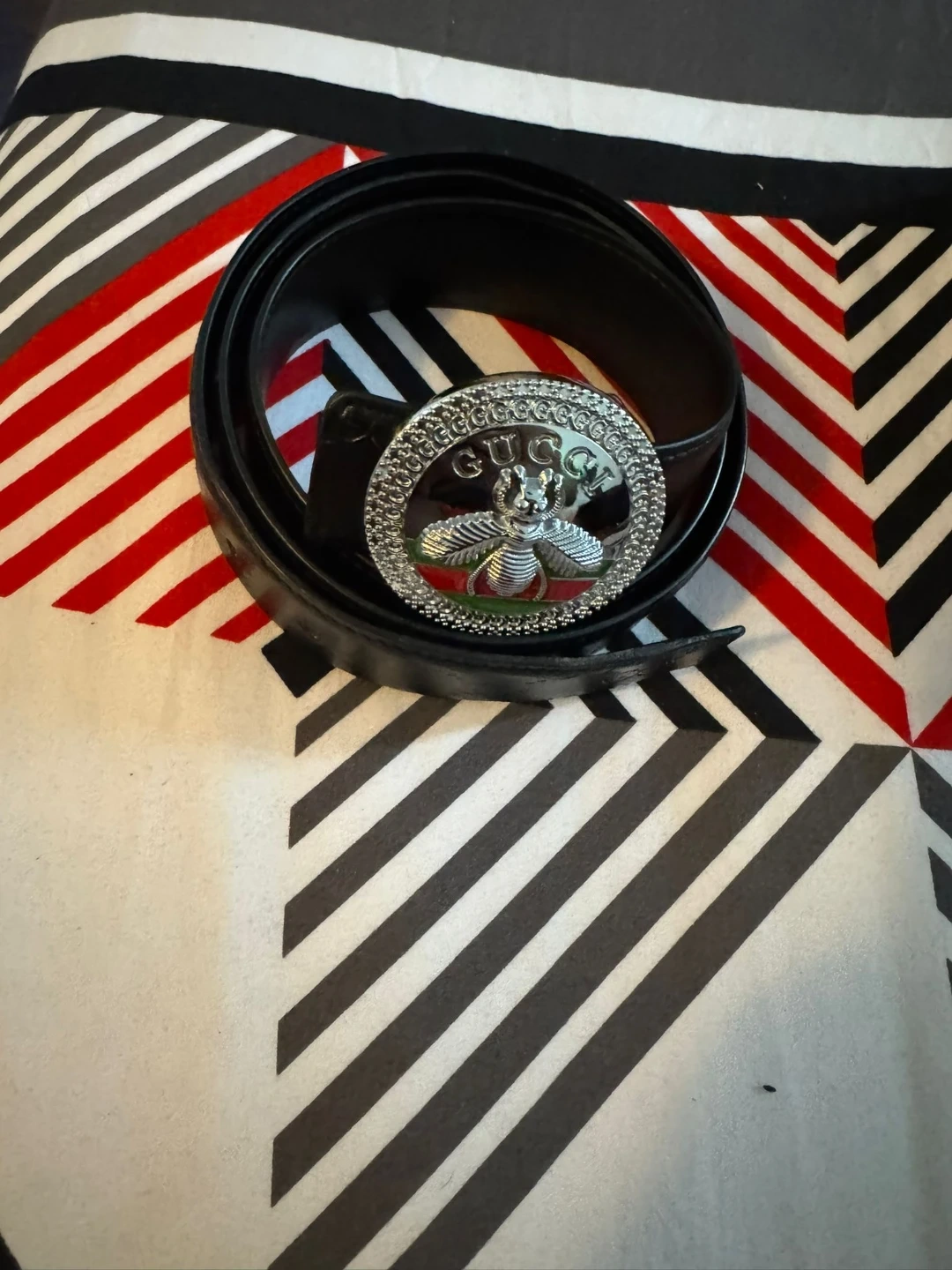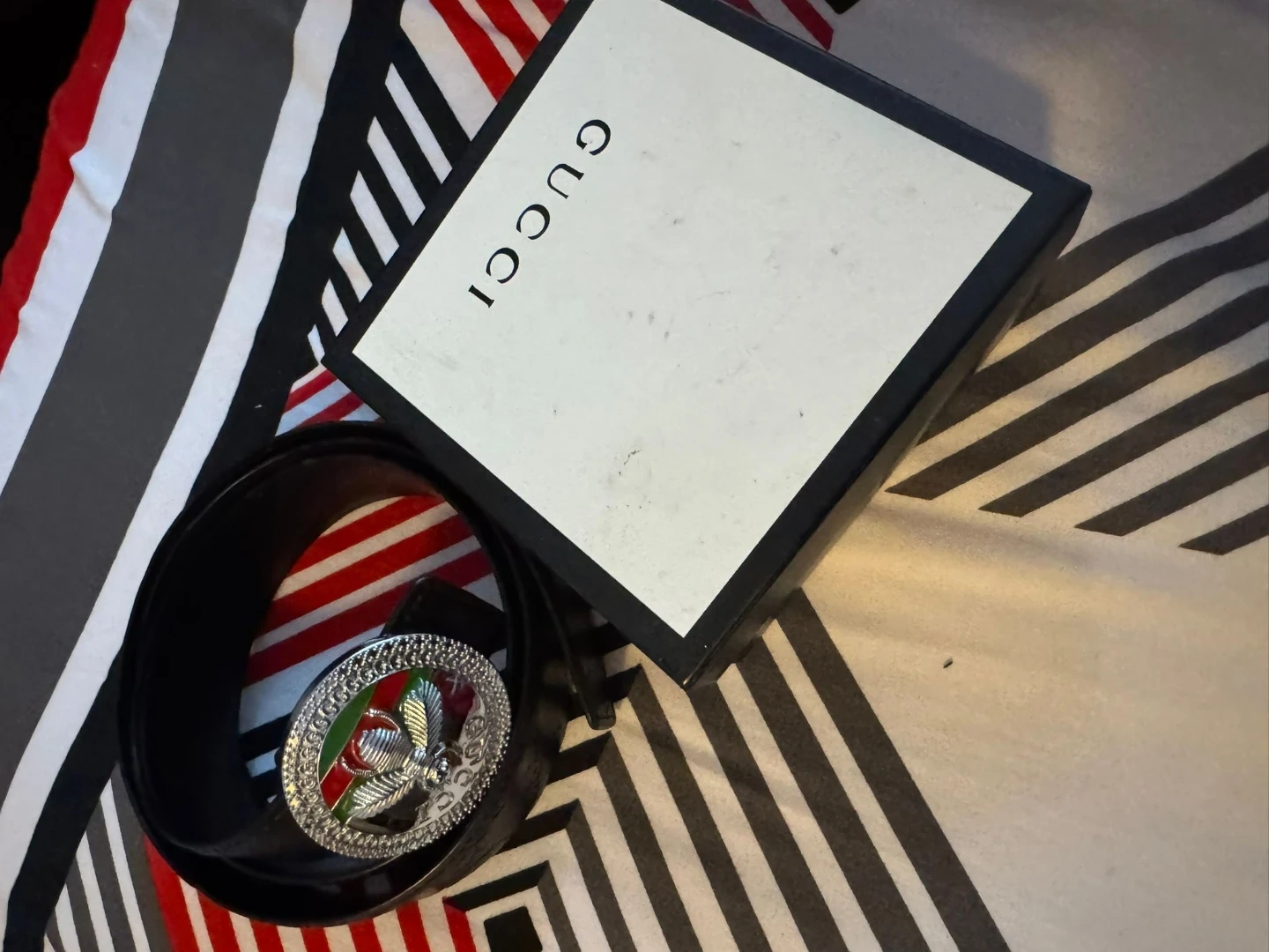 Selling a Gucci belt in great condition! It's a stylish black leather belt that comes with its original box. The buckle is quite unique. Feel free to message me with any questions!