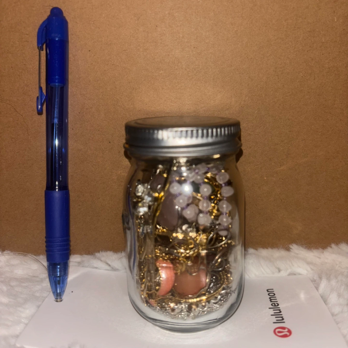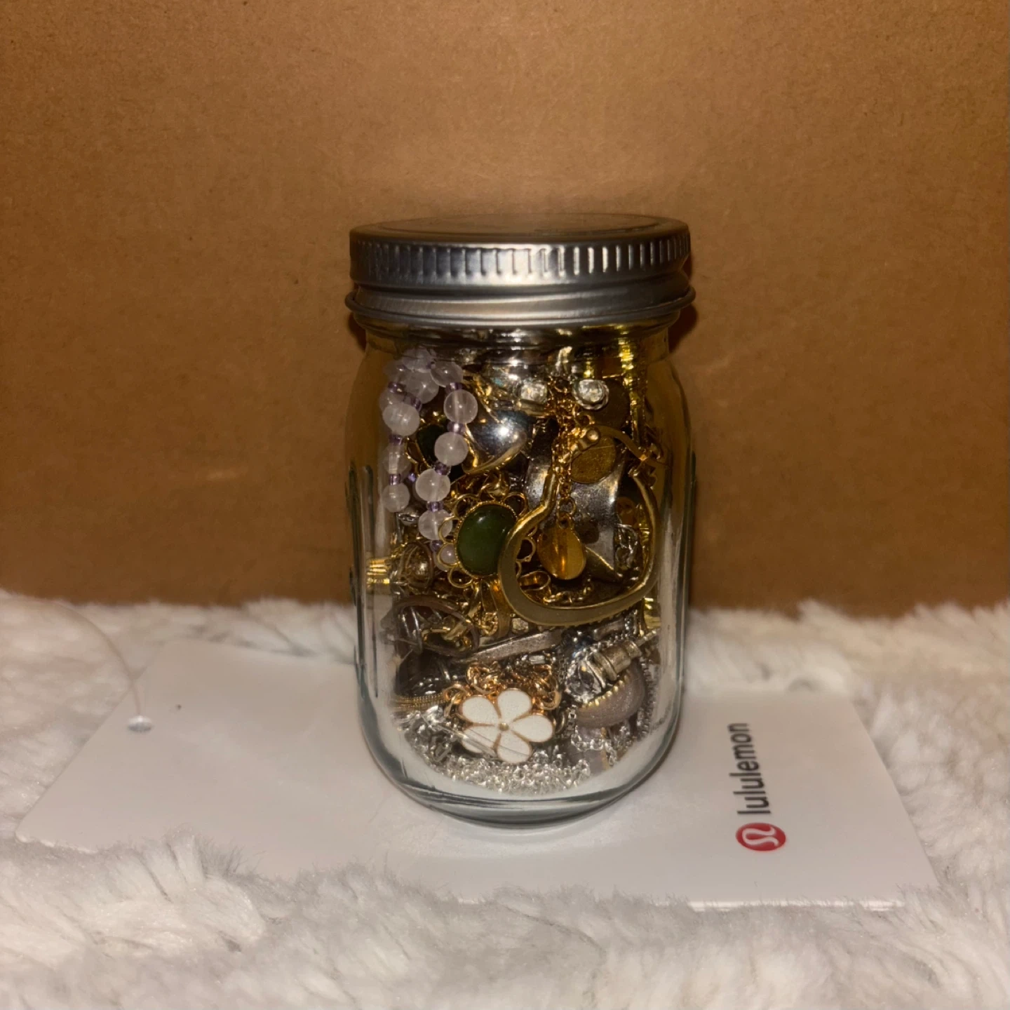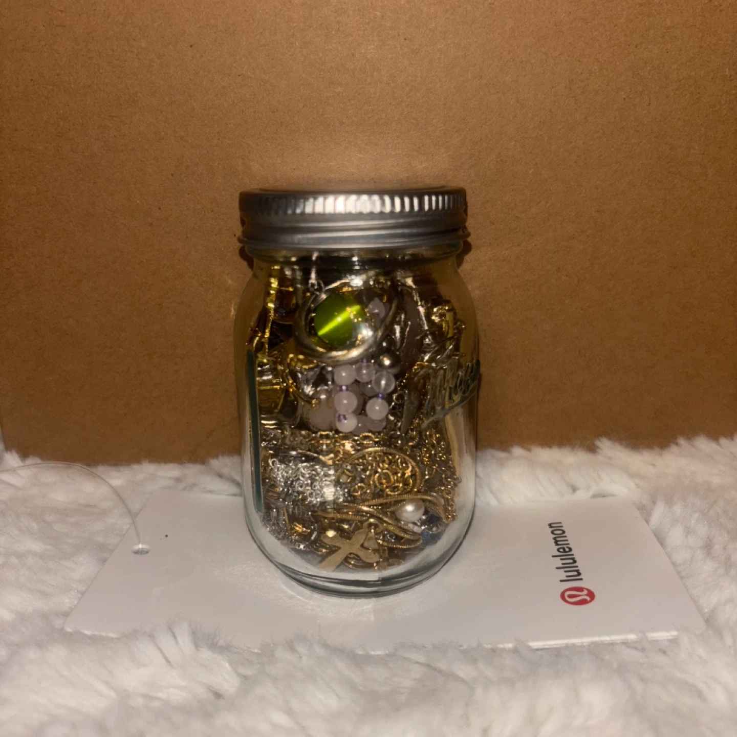 Selling a jar filled with assorted jewelry! There's a mix of gold and silver-toned pieces, including necklaces, pendants, and beads. Perfect for anyone looking to add to their collection.