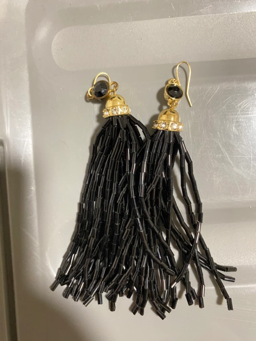 Selling a pair of tassel earrings in black. These earrings feature beaded tassels and gold-tone accents, perfect for adding a touch of elegance to any outfit!