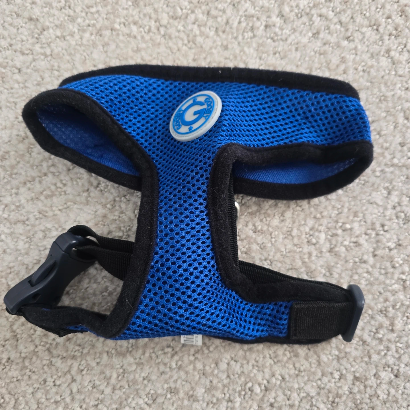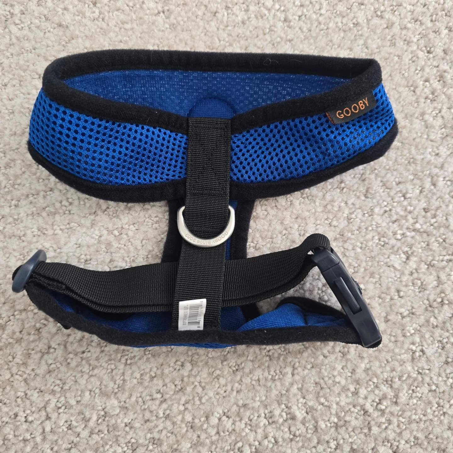This is a Gooby Comfort X Head-In Harness for your furry friend! It's a vibrant blue colour and in great condition. Perfect for walks and outdoor adventures!