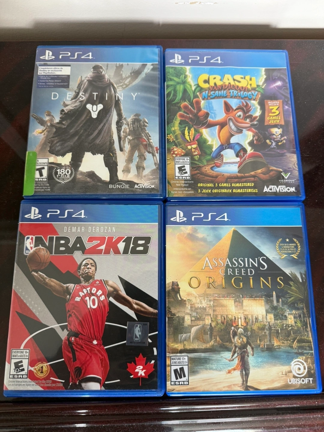 Sony PlayStation 4 console. Includes one blue controller and four games: Destiny, Crash Bandicoot N. Sane Trilogy, NBA 2K18, and Assassin's Creed Origins. Pre-owned. No HDMI cable included.