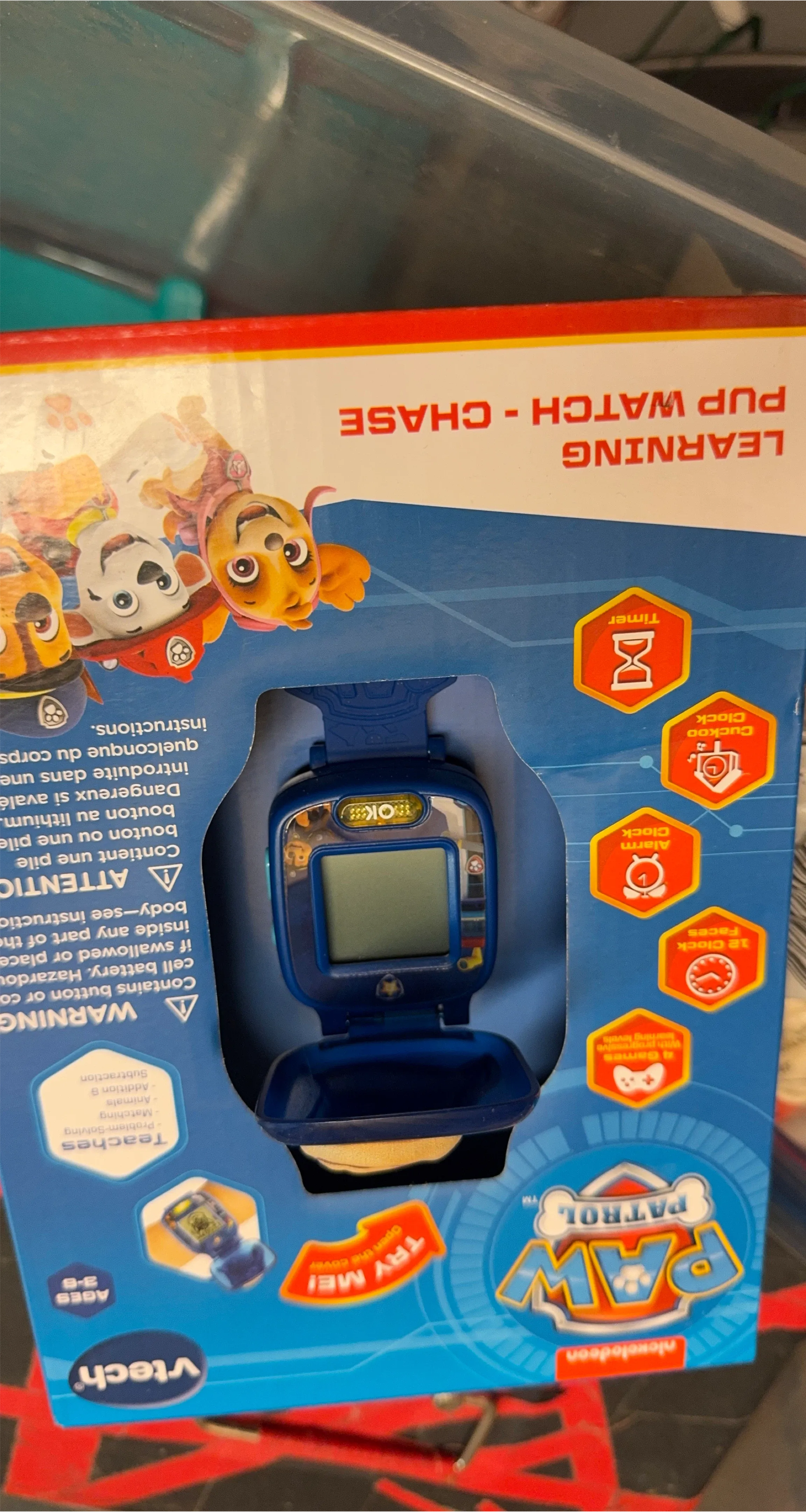 I'm selling a brand new VTech Paw Patrol Learning Pup Watch featuring Chase! This watch teaches problem-solving, matching, animals, addition, and subtraction. It also has a timer, alarm clock, cuckoo clock, and 12 clock faces. It's perfect for ages 3-6 and includes 4 games with progressive learning levels. The box is included!