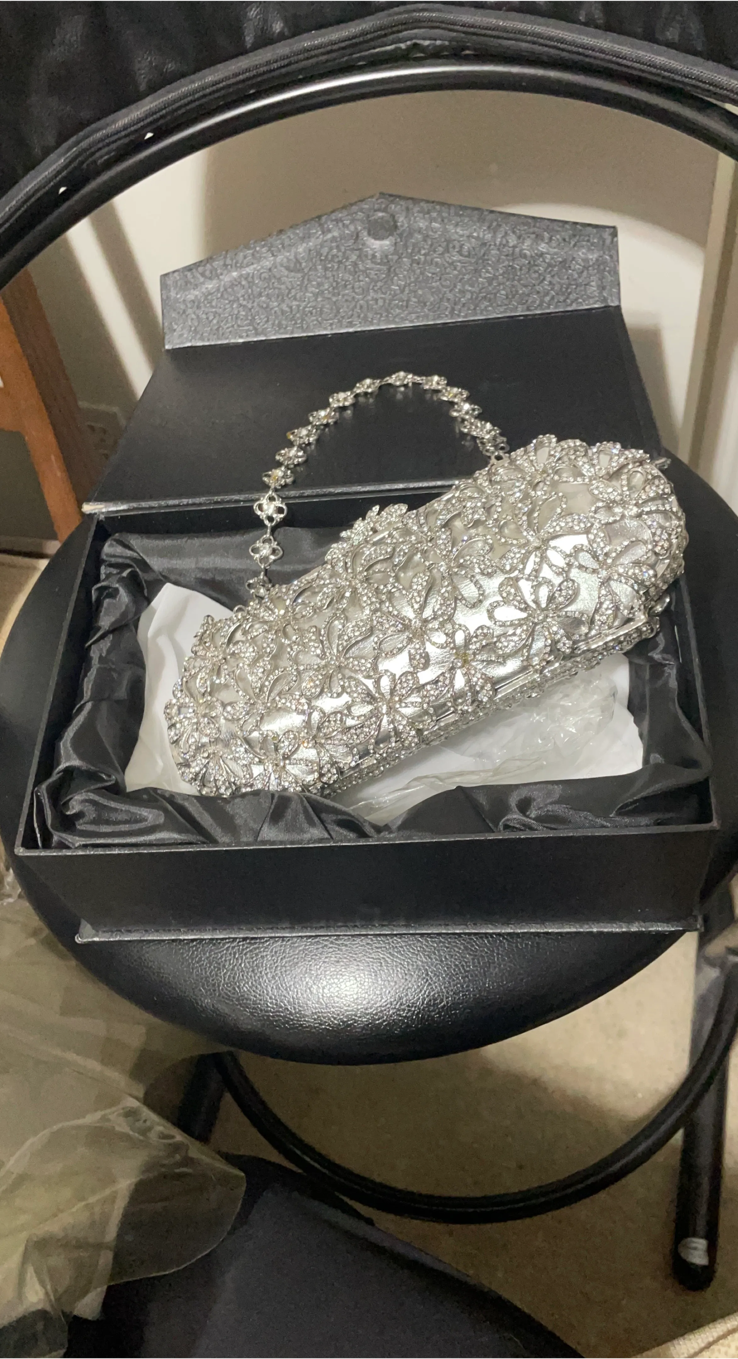 Selling a beautiful silver evening clutch bag. It's adorned with rhinestones and comes with a chain strap. It also comes with its original box! It’s brand new, just been in storage for a while