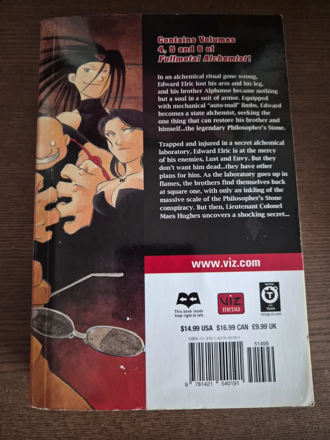 Selling Fullmetal Alchemist 3-in-1 manga, containing volumes 4, 5, and 6. Story and art by Hiromu Arakawa. Published by Viz Media. Rated T for Teen.