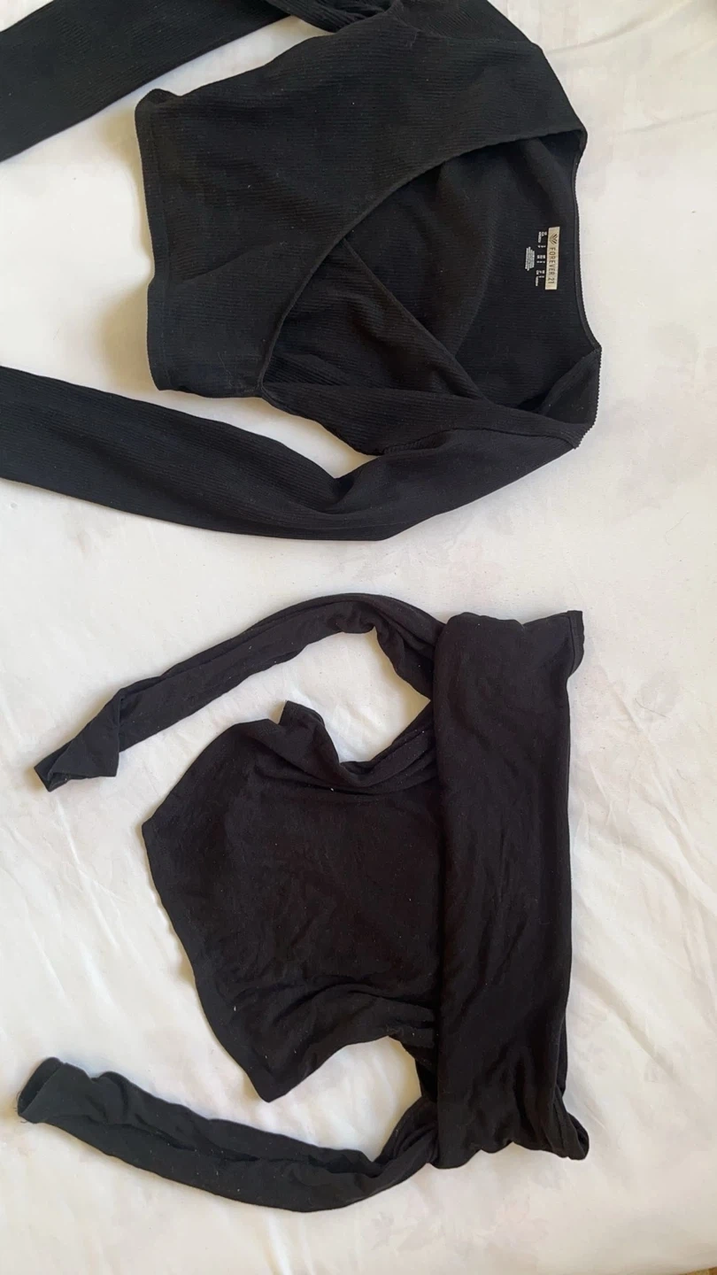 I'm selling a cute black long sleeves and wrap tops! They are a size S and M and in great condition. Perfect for layering or wearing on its own