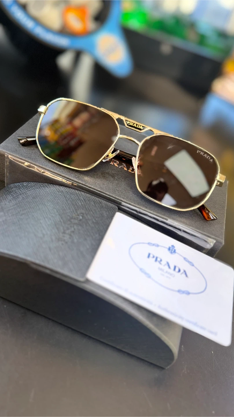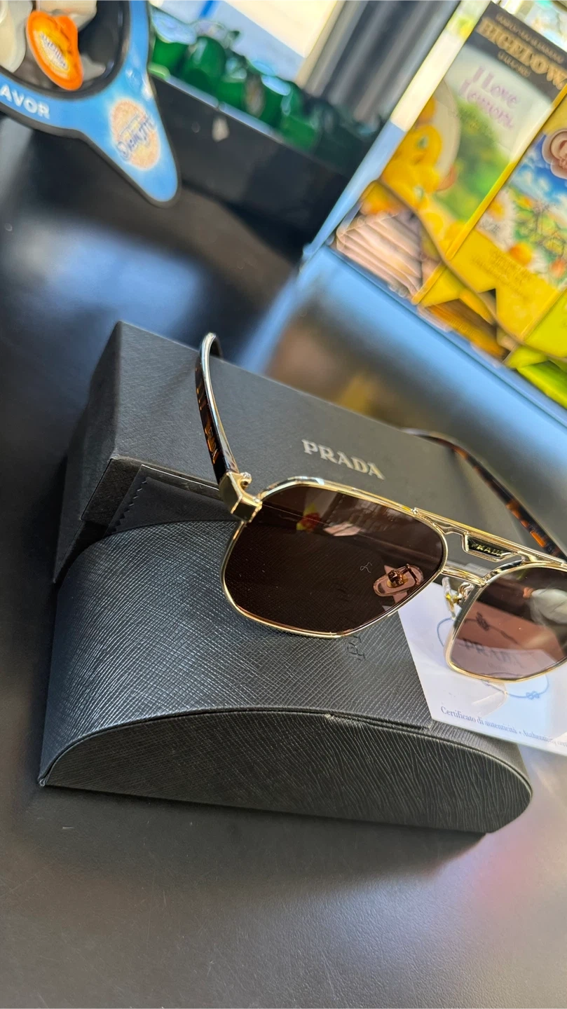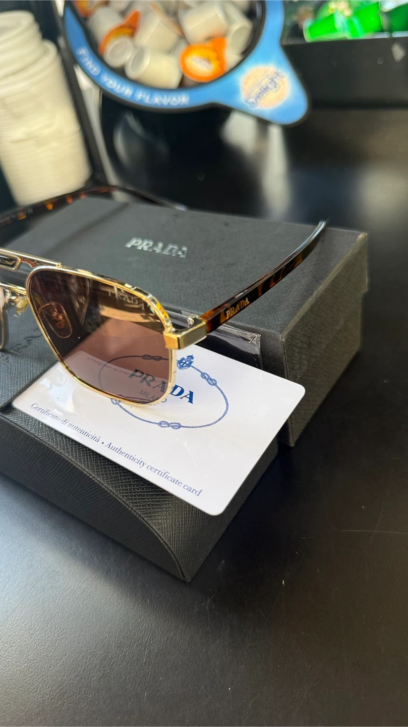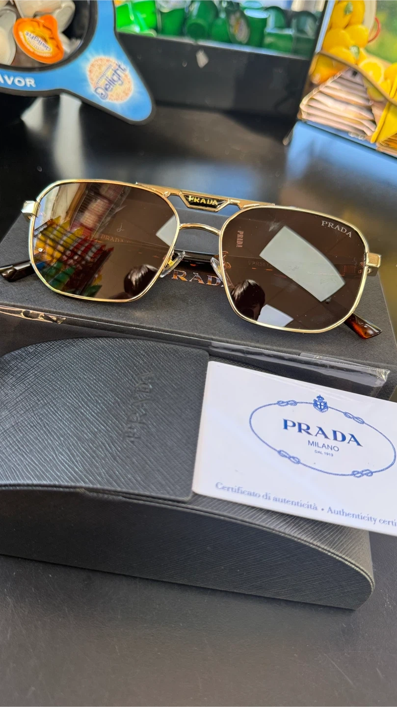 Selling a pair of Prada aviator sunglasses with a gold frame. Includes the original box and certificate of authenticity. Perfect for adding a touch of style to any outfit!