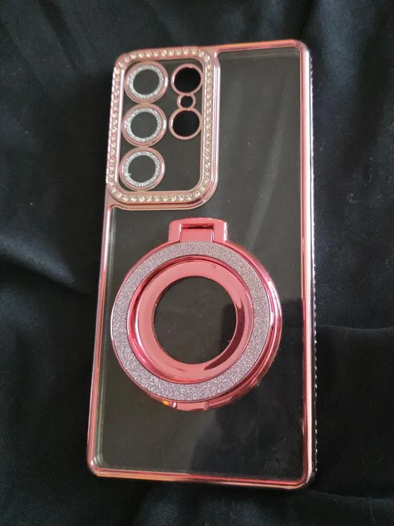 Rose gold phone case with a ring stand! It's in great condition and has a sparkly, blingy look with the rhinestones around the camera and ring stand. It fits a Samsung Galaxy S25 Ultra phone.