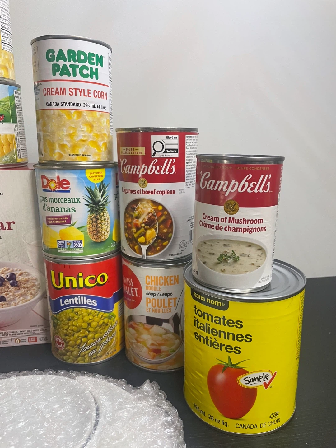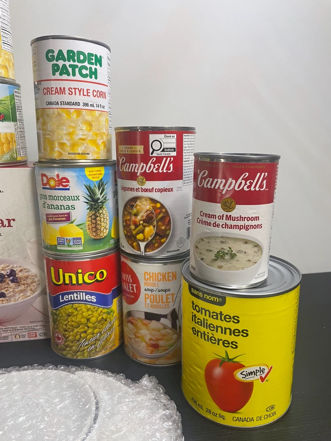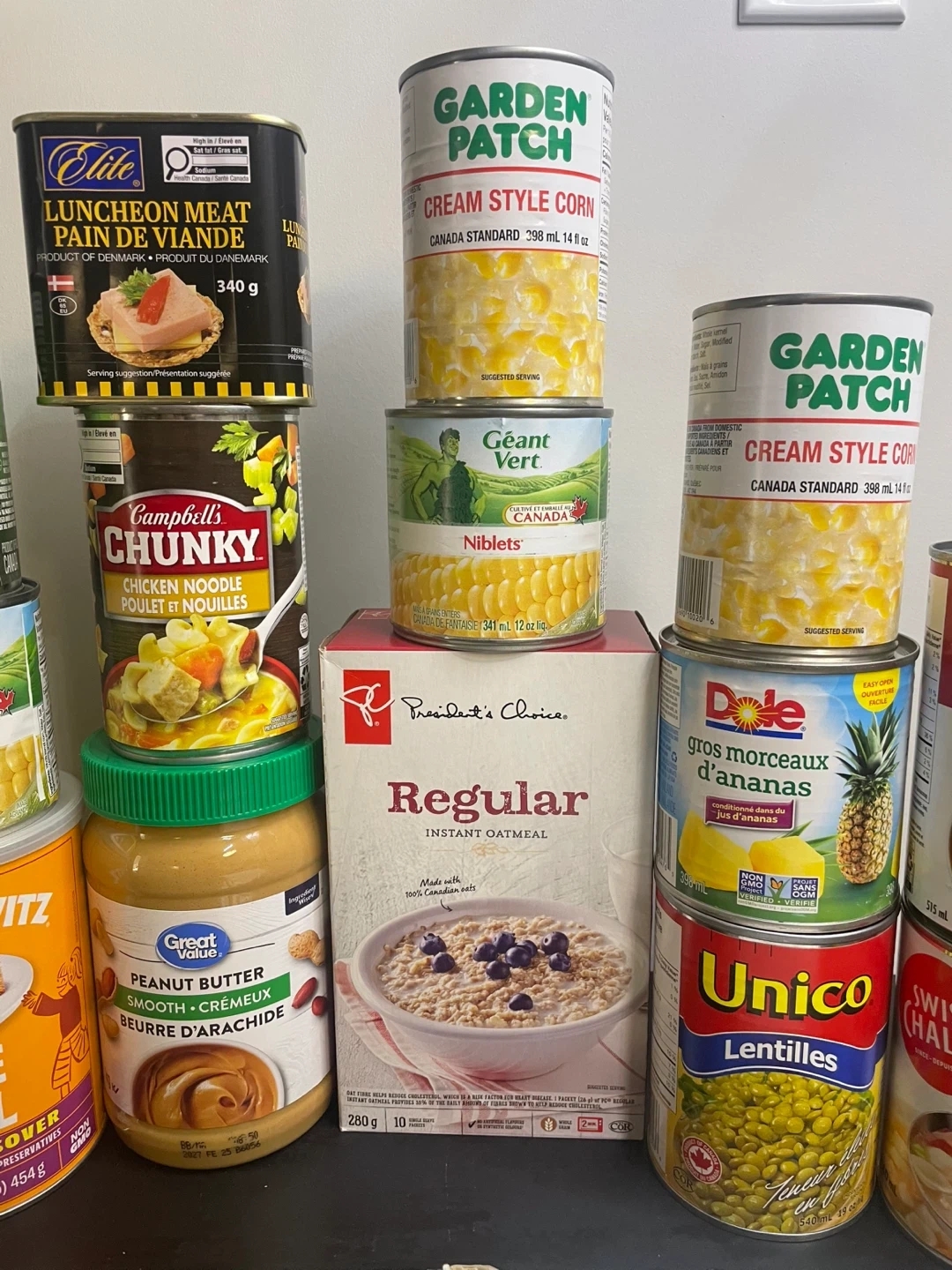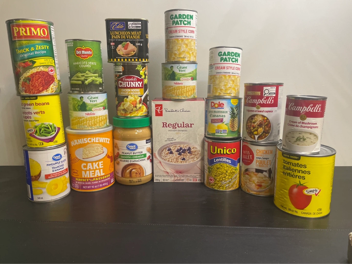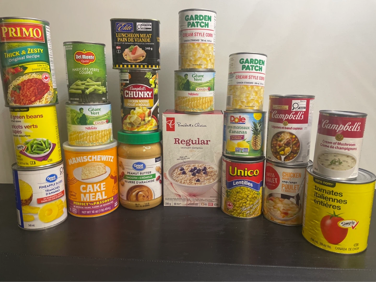 A collection of canned vegetables, soups, pineapple, lunceon meat, and instant oatmeal. Includes items from brands like Primo, Del Monte, Garden Patch, Campbell's, Dole, Unico, Manischewitz, and President's Choice. Great for stocking your pantry!