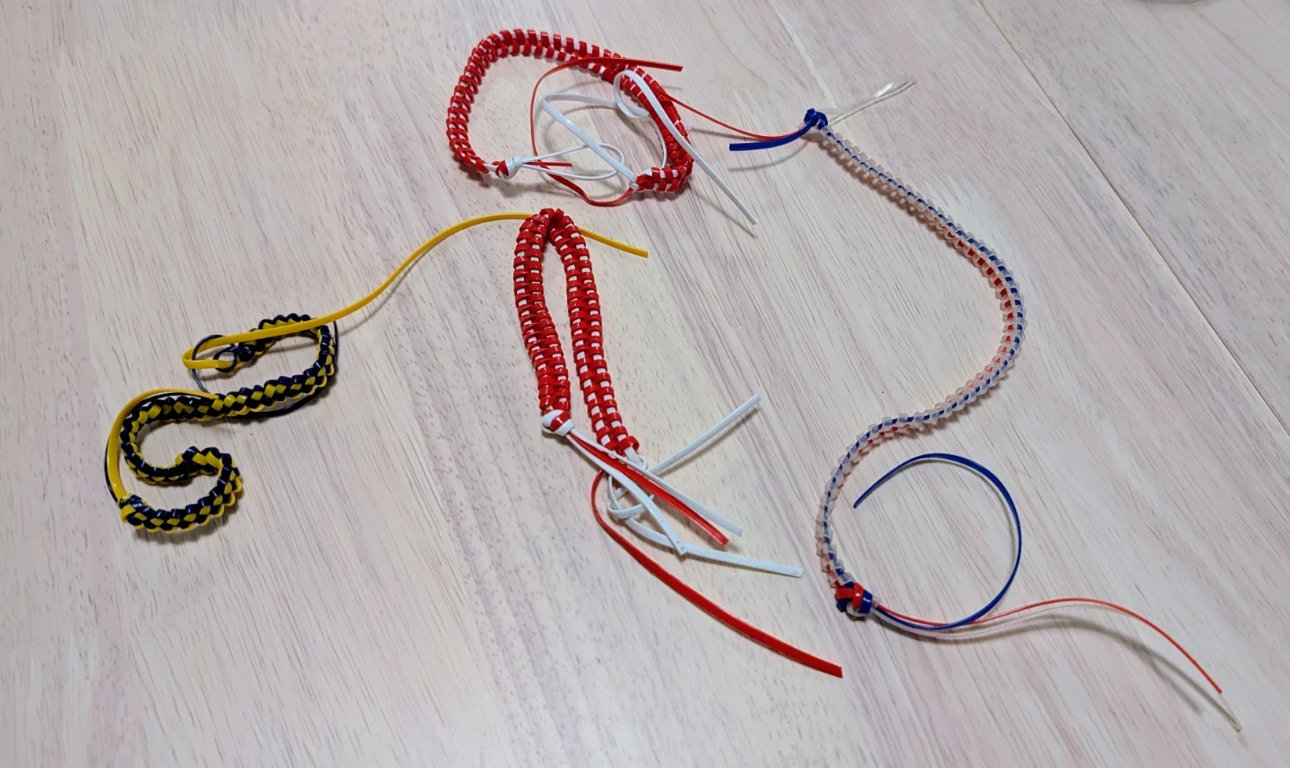 Selling a few handmade braided cord bracelets. They come in different colours, including red/white, yellow/black, and red/white/blue. Perfect for adding a unique touch to your keys or bag