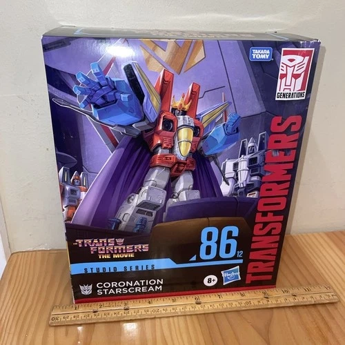The Hasbro Transformers Studio Series #86-12 CORONATION STARSCREAM Leader Class action figure is a highly detailed and collectible item based on the popular Transformers TV show and movie series. Standing at 8 inches tall, this plastic figure features transforming abilities, a colorful design, and comes boxed in its original packaging. It includes weapons, a cape, and a throne, making it a must-have for fans of the Decepticon character Starscream. With its accurate representation of the character and high-quality brand, this Studios Series figure is a great addition to any Transformers collection. See all pictures of item