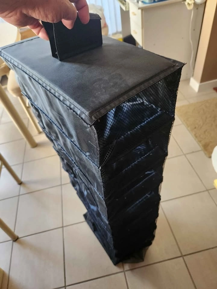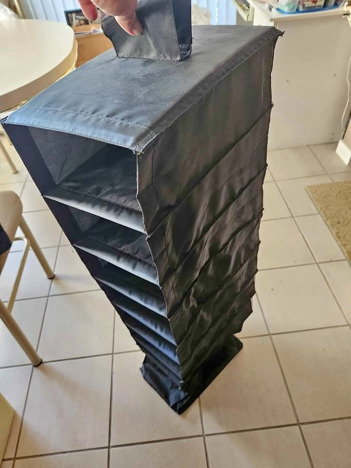 Shoe or other storage for inside closet or outside. Expands to 48" in height or will fold for easy storage.