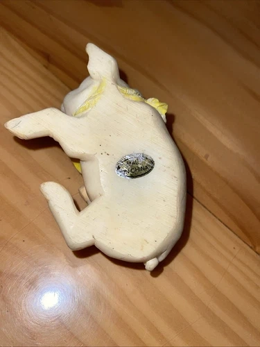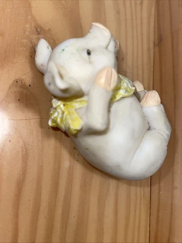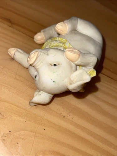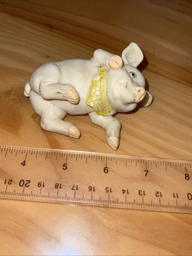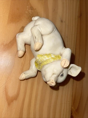 This vintage figurine features a cute little piggy wearing a bandana. Made of resin and manufactured in China, this charming collectible is perfect for any pig or animal lover. Not handmade and in good condition, it's a great addition to any farm or countryside-themed collection. Ideal for display on a shelf or as part of a larger figurine set. See all pictures of item. Sold as is.