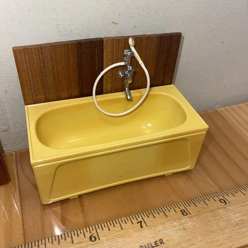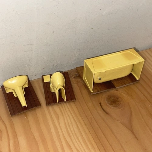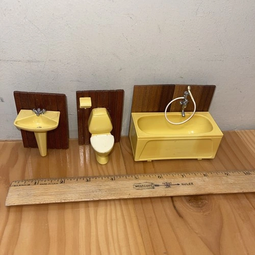 The Lundby vintage dollhouse bathroom set includes a toilet, sink, and bathtub in 1:16 scale. Made of plastic in Sweden, this original yellow-colored set is perfect for adding a nostalgic touch to a dollhouse bathroom. The high-quality materials and vintage design make it a charming addition to any miniature collection, bringing a touch of retro style to the room. See all pictures of item