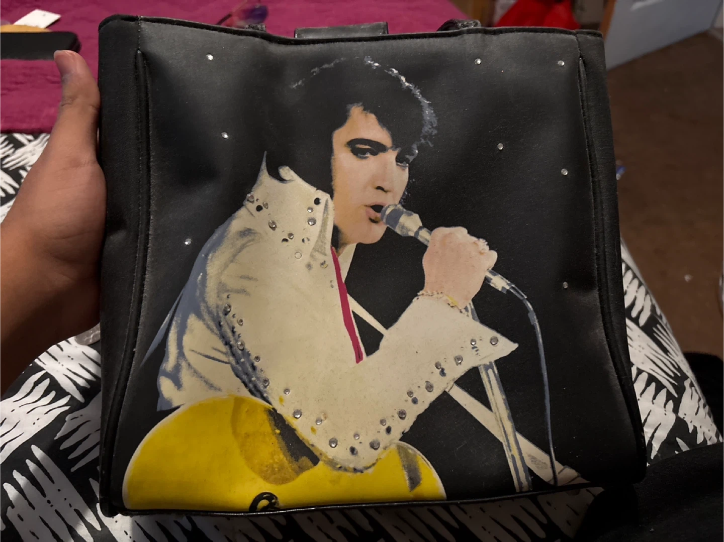Selling a black tote bag featuring Elvis Presley. It has some signs of wear, as shown in the pictures, but is still in good condition!