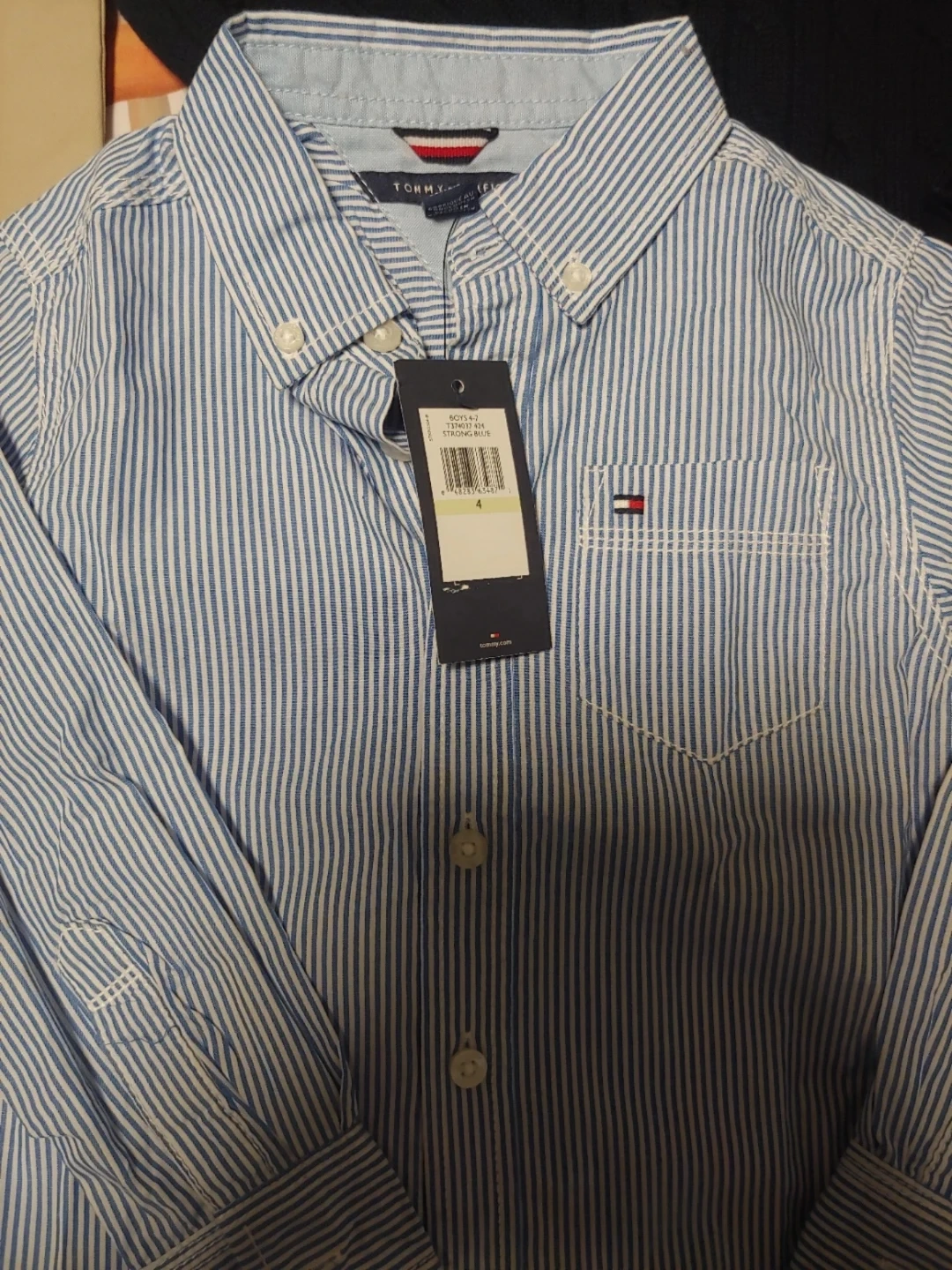 Also included is a brand new Tommy Hilfiger button-down shirt, size 4T, in a blue and white stripe.