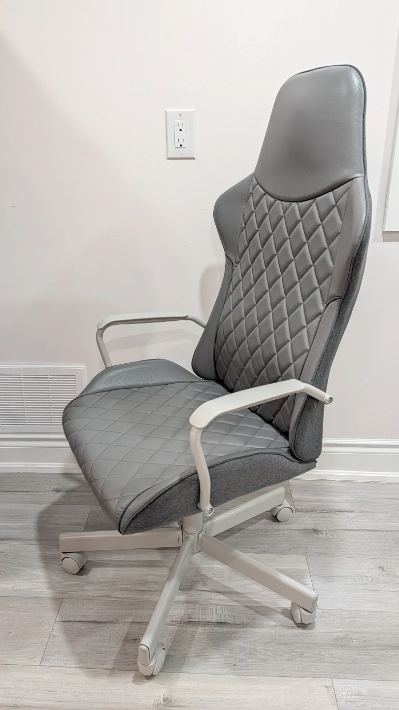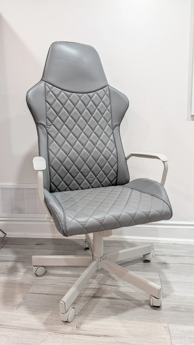 Selling my IKEA UTESPELARE gaming/office chair. This is a high-performance chair that looks great in a gaming setup or a professional home office. It features a sleek gray faux-leather finish with stylish diamond-quilt stitching.