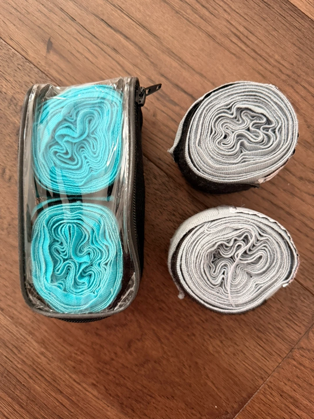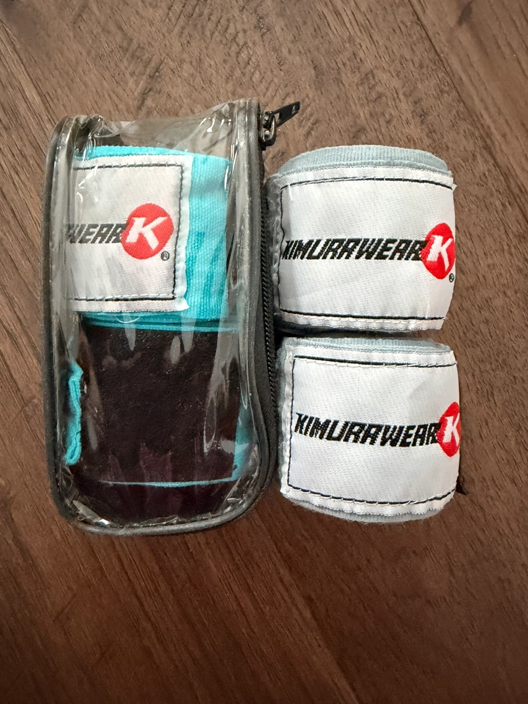 Selling a set of Kimurawear boxing hand wraps! They come with a handy carrying case to keep everything organized. The set includes wraps in light blue, and grey in excellent condition. Perfect for your training needs.