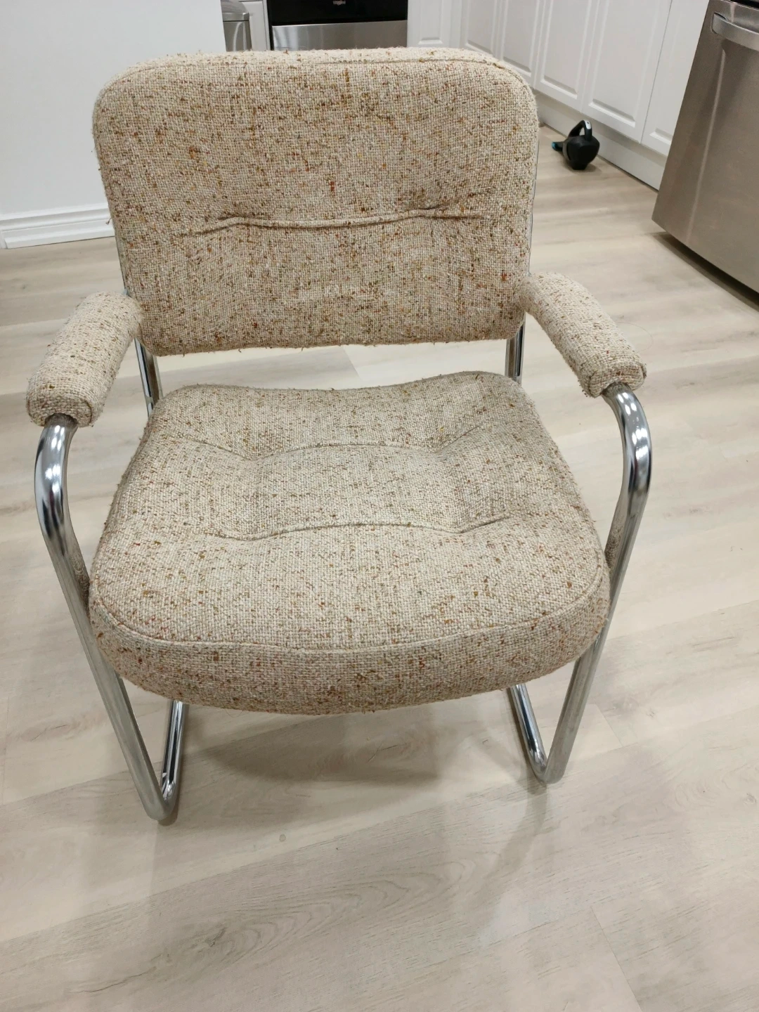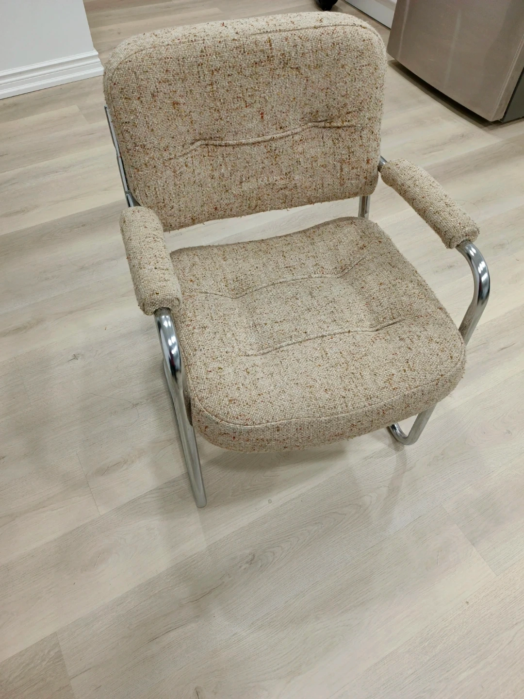 Selling a vintage armchair with a steelcase and neutral-toned fabric upholstery. It has a unique design and is in good condition for its age. The chair provides comfortable seating with padded armrests. Perfect as an accent piece!