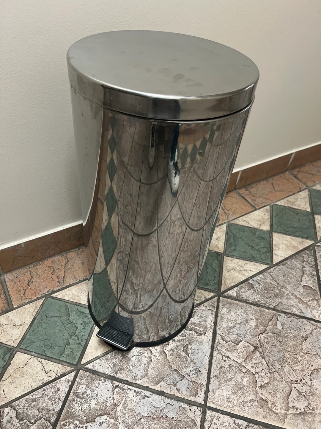 Selling a stainless steel step-on trash can. It's in great condition and perfect for any room! The step-on feature makes it super convenient to use 13 gal / 49lt. Large bags.