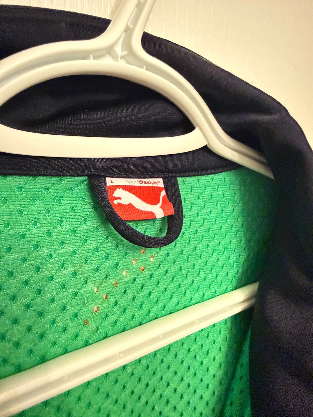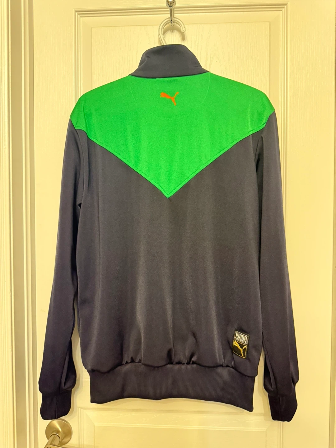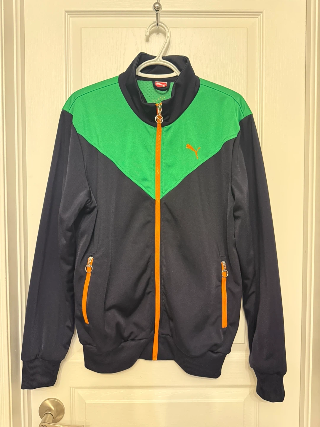 Selling a Puma Archive track jacket in size large! The jacket features a cool navy and green colour block design with orange accents. It's in great condition and perfect for adding a sporty touch to your wardrobe