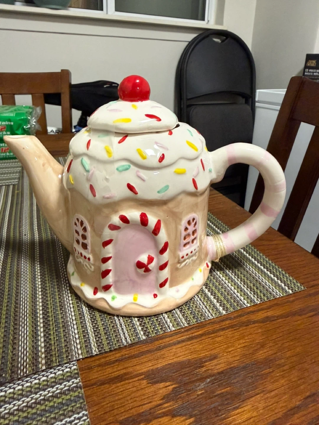 Super cute gingerbread house teapot! It's shaped like a little house with a candy cane door and a sprinkle-covered roof. Perfect for adding a touch of whimsy to your tea time