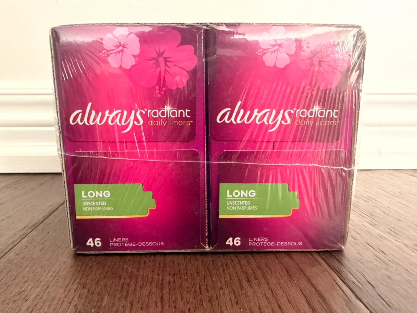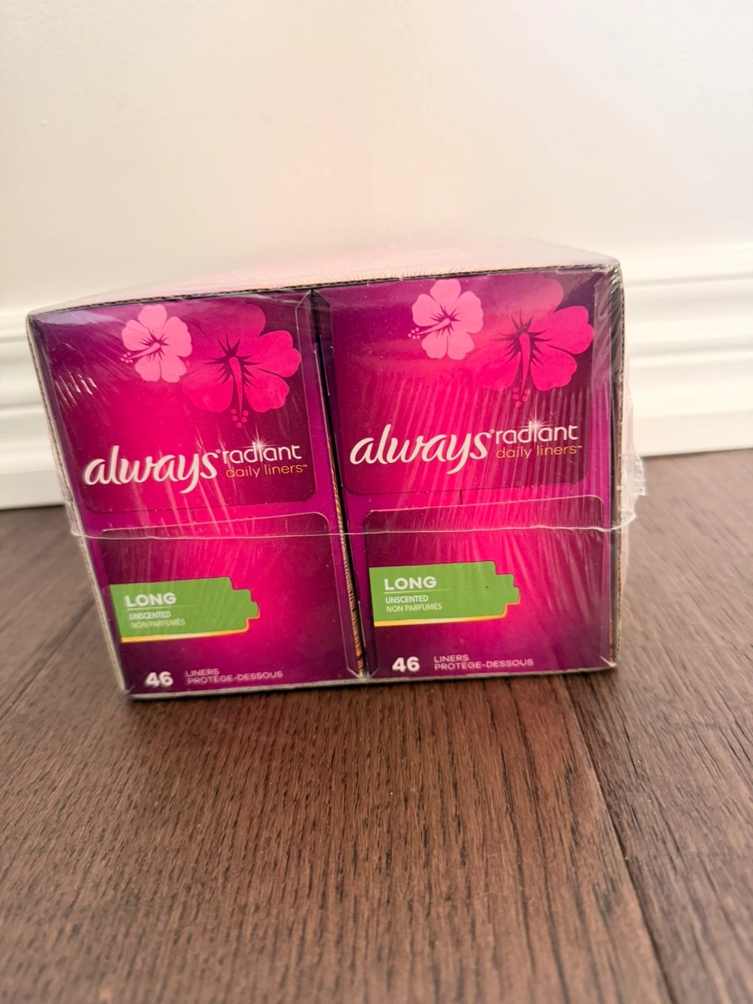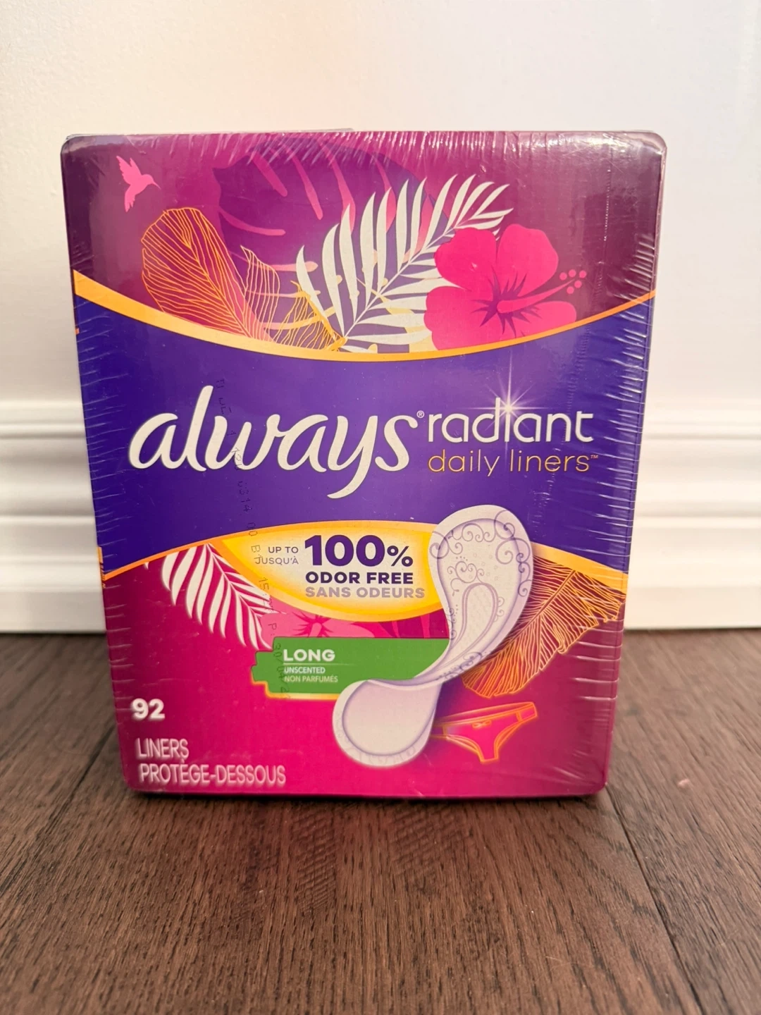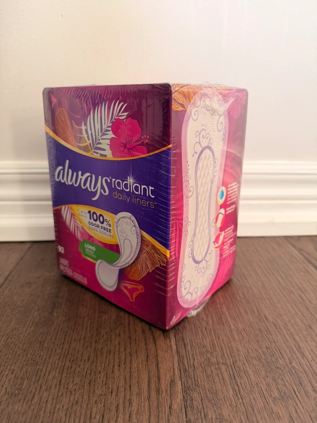 I'm selling a brand new, unopened package of Always Radiant Daily Liners. These are the long version and contain 92 liners. They are 100% odour free and unscented!