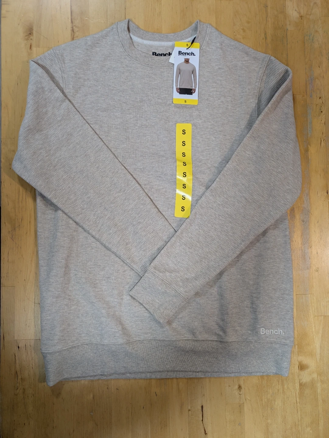 I'm selling a brand new Bench. crewneck sweater! It's a size small and has a beige waffle knit texture. Perfect for layering or wearing on its own. Never worn and still has the tags on!