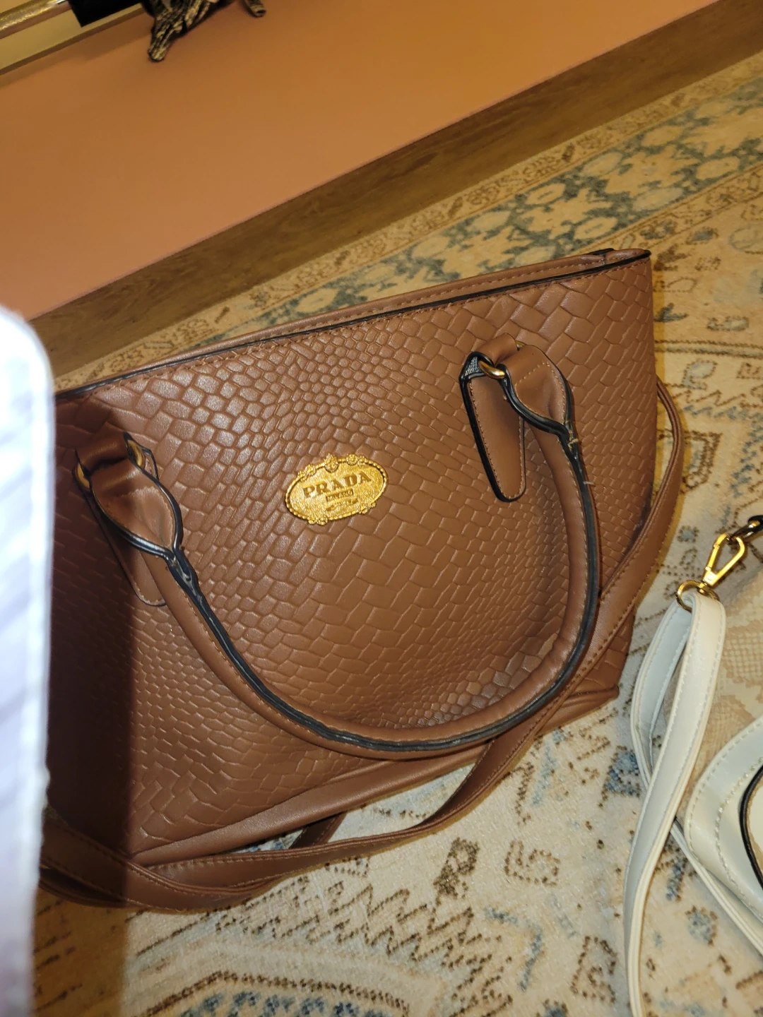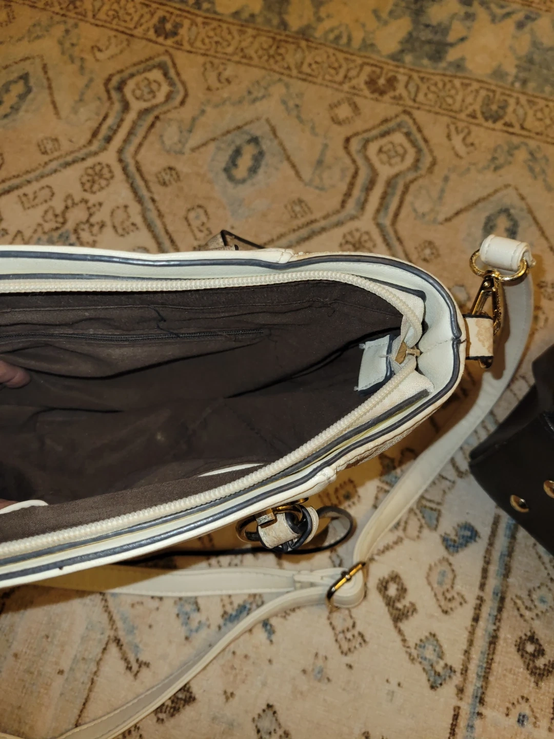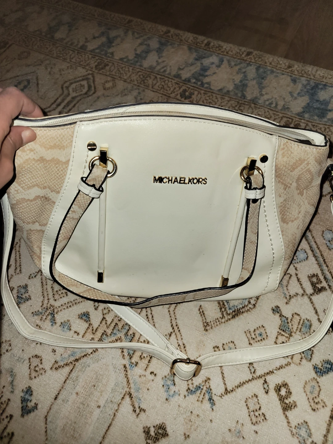 I'm selling a Michael Kors handbag in white and beige. It's in good condition and has a shoulder strap. It's perfect for everyday use!