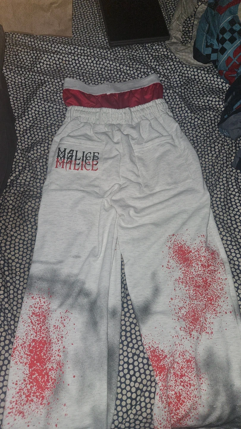 Selling a pair of Silent Hill inspired sweatpants! They're a size Large and feature text from the game on the upper left leg. The design also includes red splatter graphics. These are perfect for any Silent Hill fan!