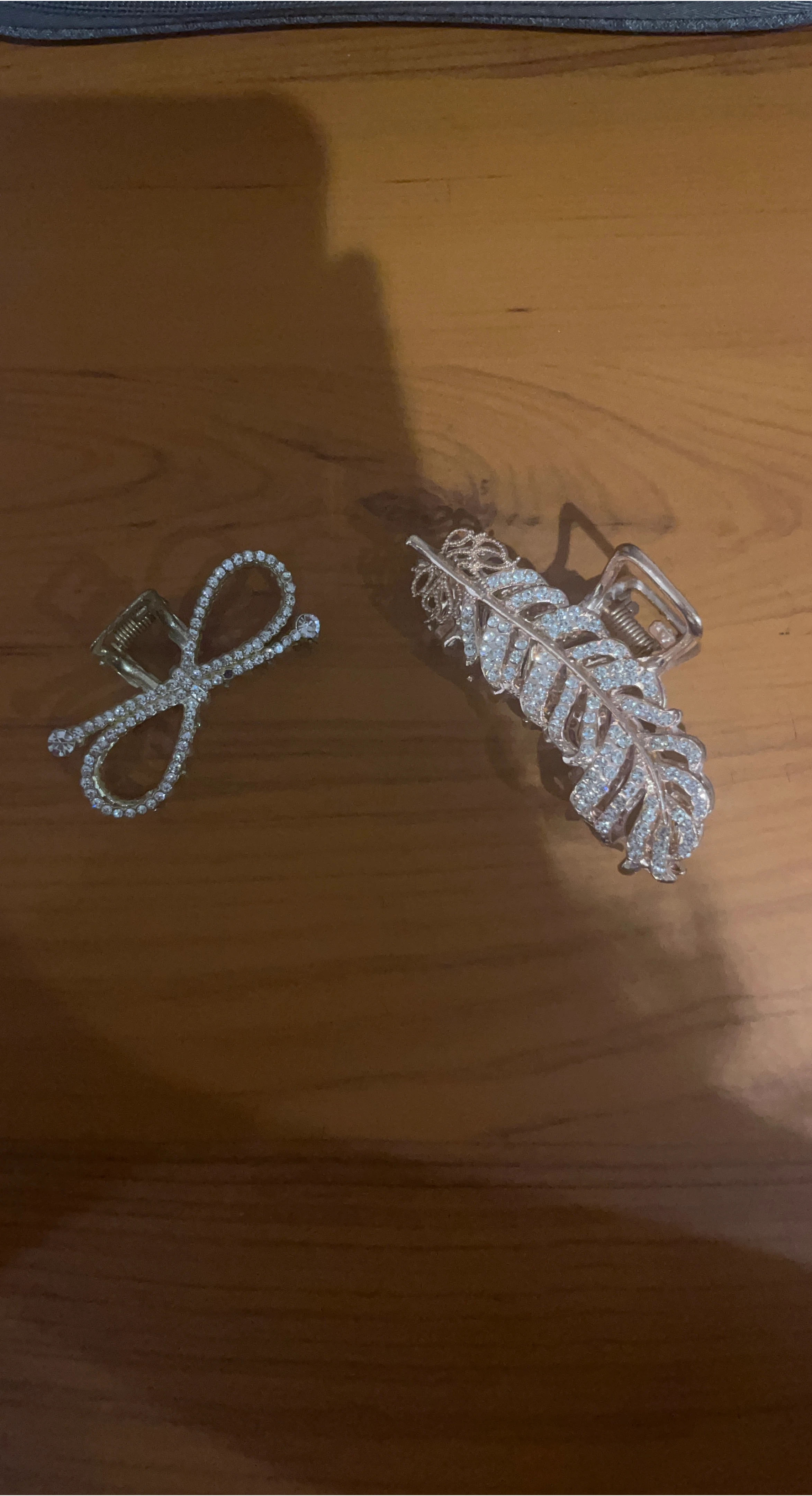 Selling two cute rhinestone hair claw clips! One is shaped like a bow and the other is a leaf. They're both in great condition and ready to add some sparkle to your hair