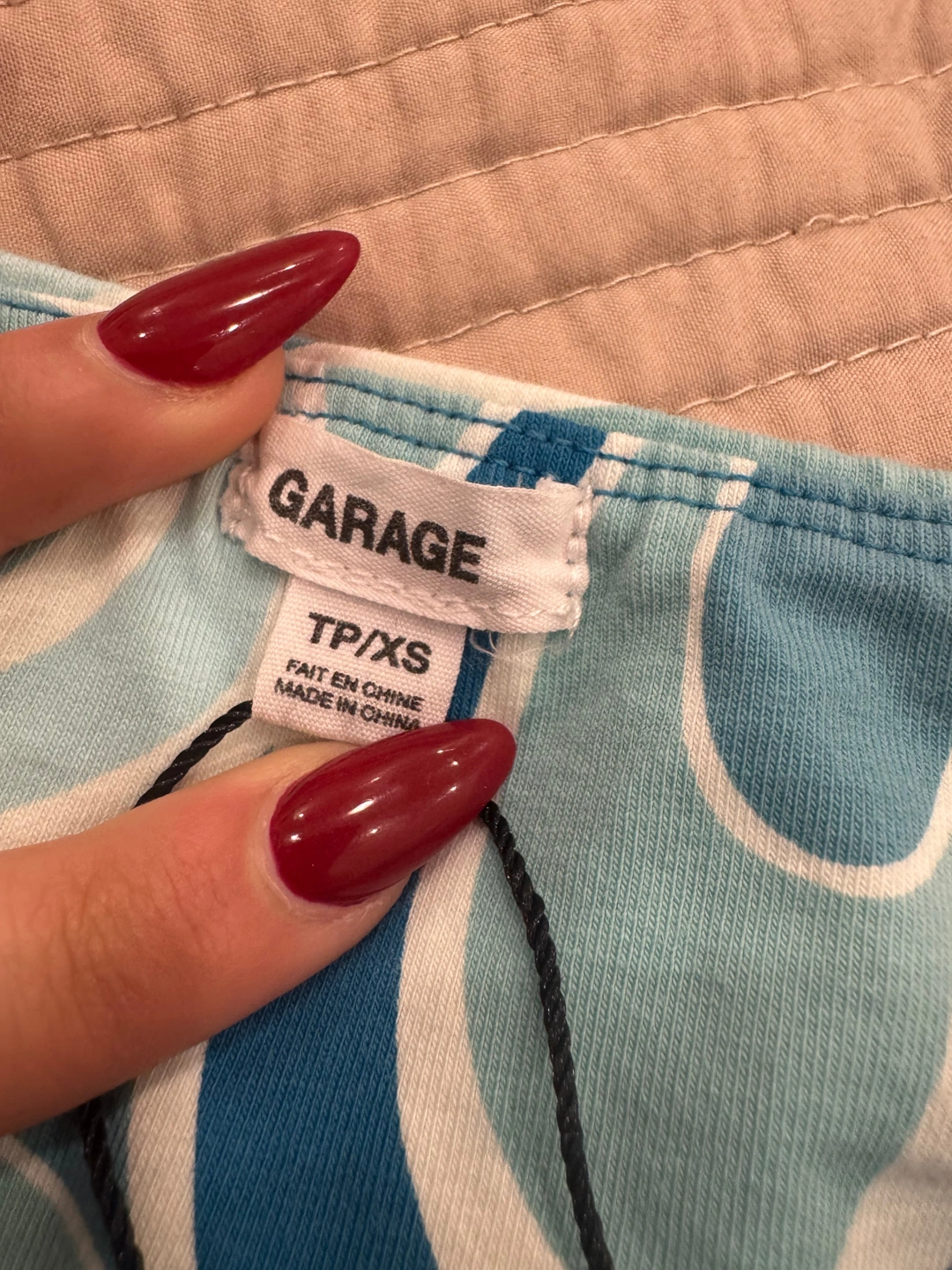 Garage brand dress in a blue, teal, and white swirl pattern.