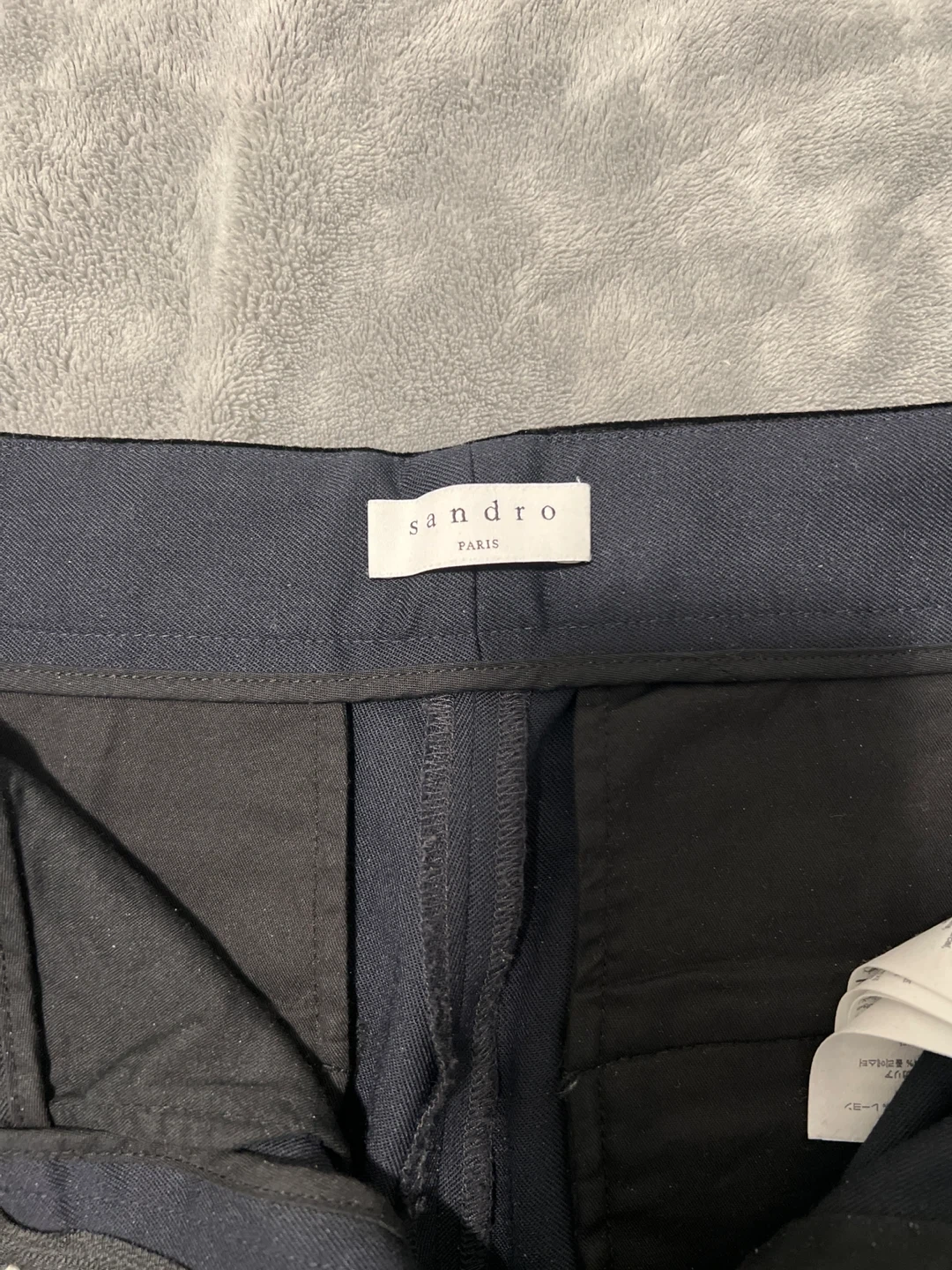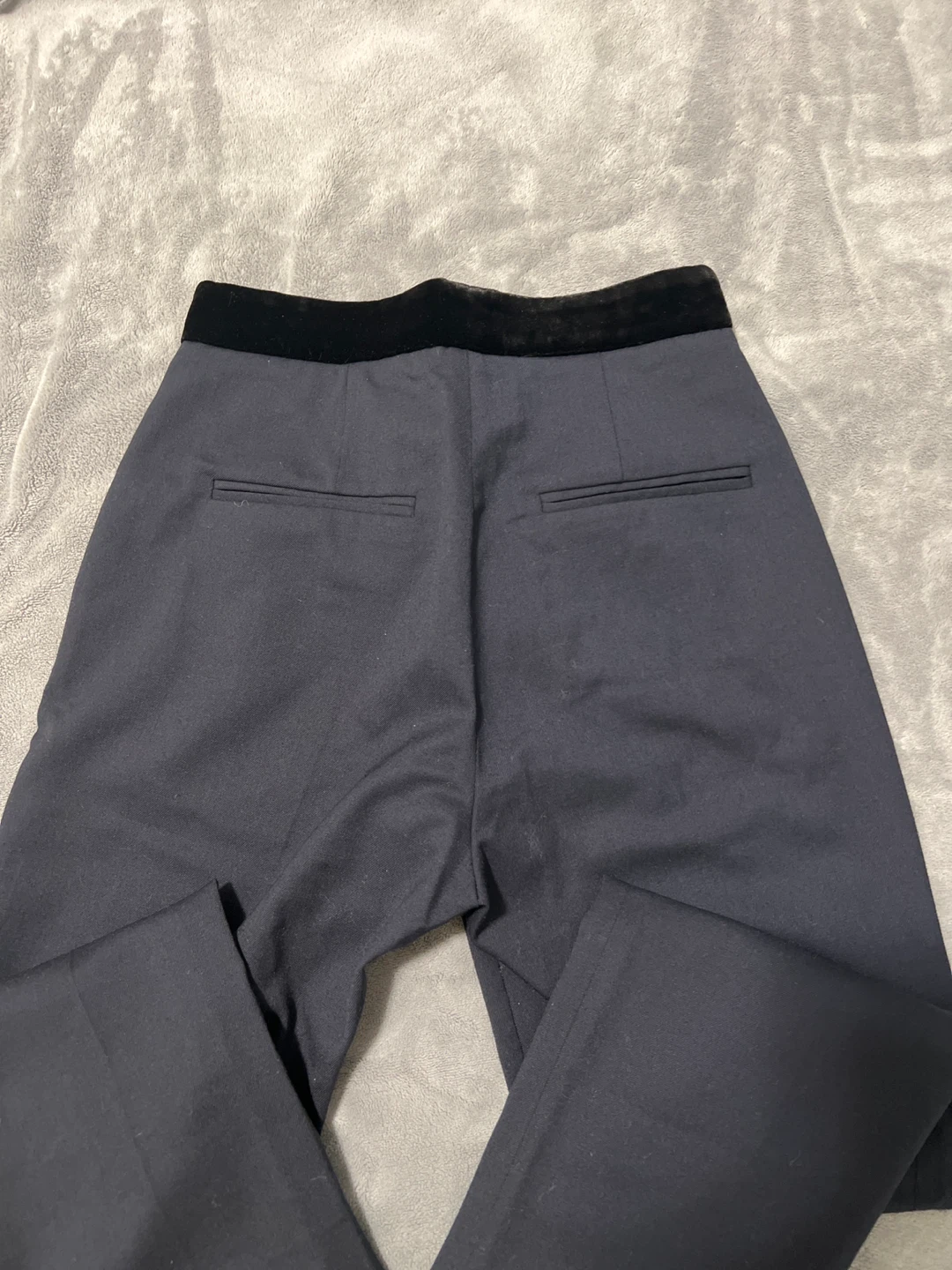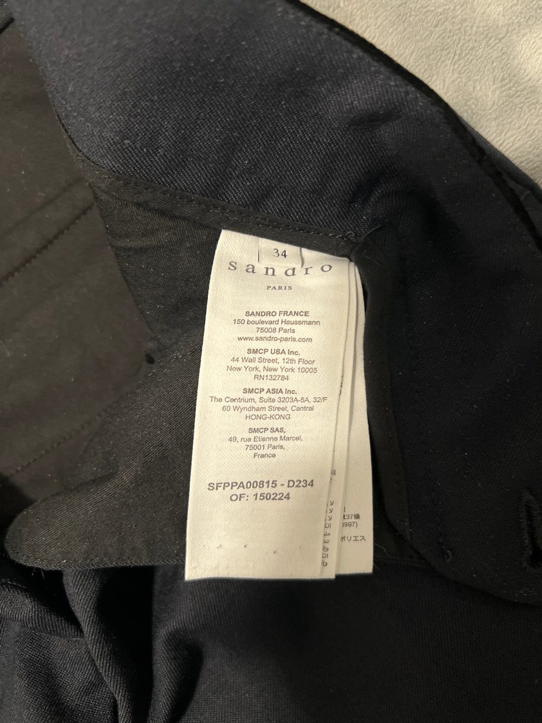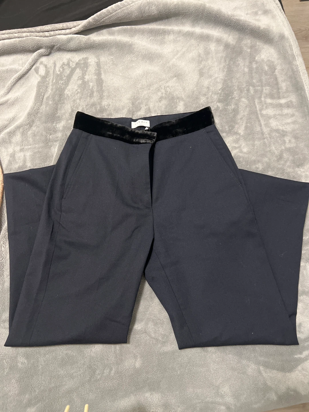 These are a pair of Sandro Paris pants in a sleek black colour. They're a size 34 and feature a stylish velvet waistband. Perfect for adding a touch of sophistication to your wardrobe! I usually wear an effortless Aritziat pan size 0. These are a bit loose. I would say effortless could be size 2. they are brand new. Never used. Bought it for $ 120+ taxes