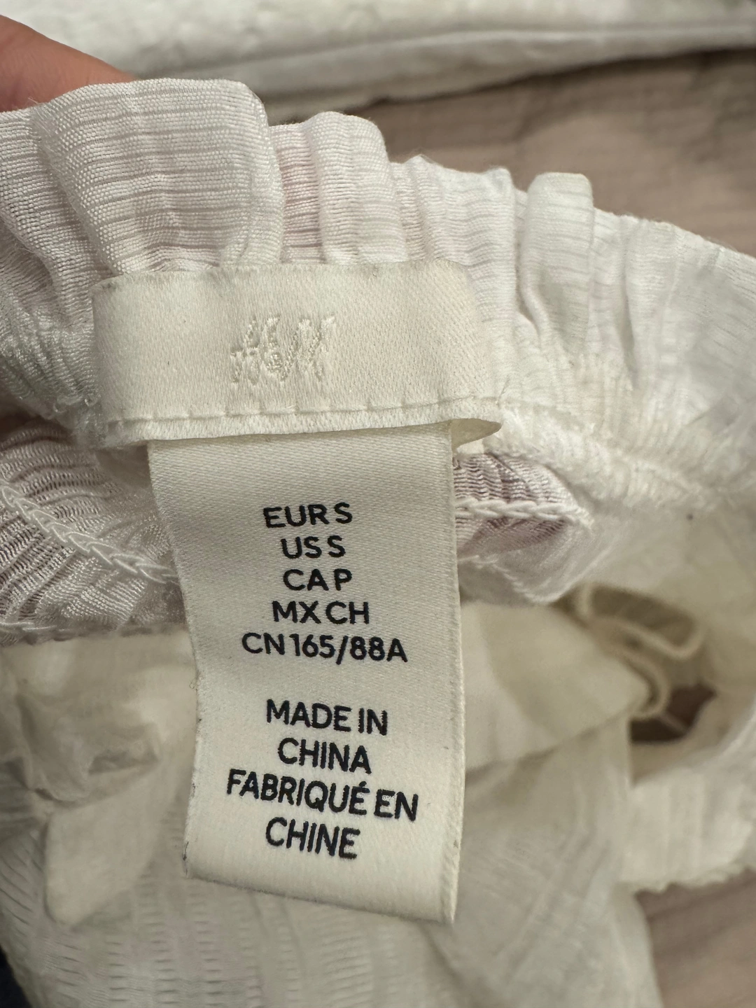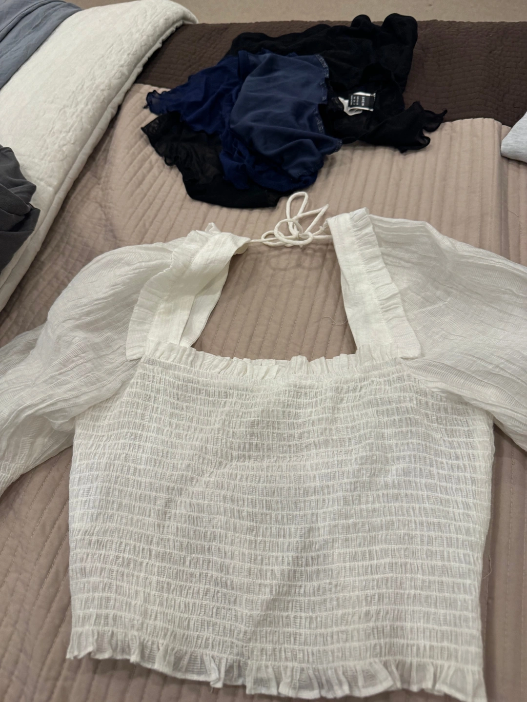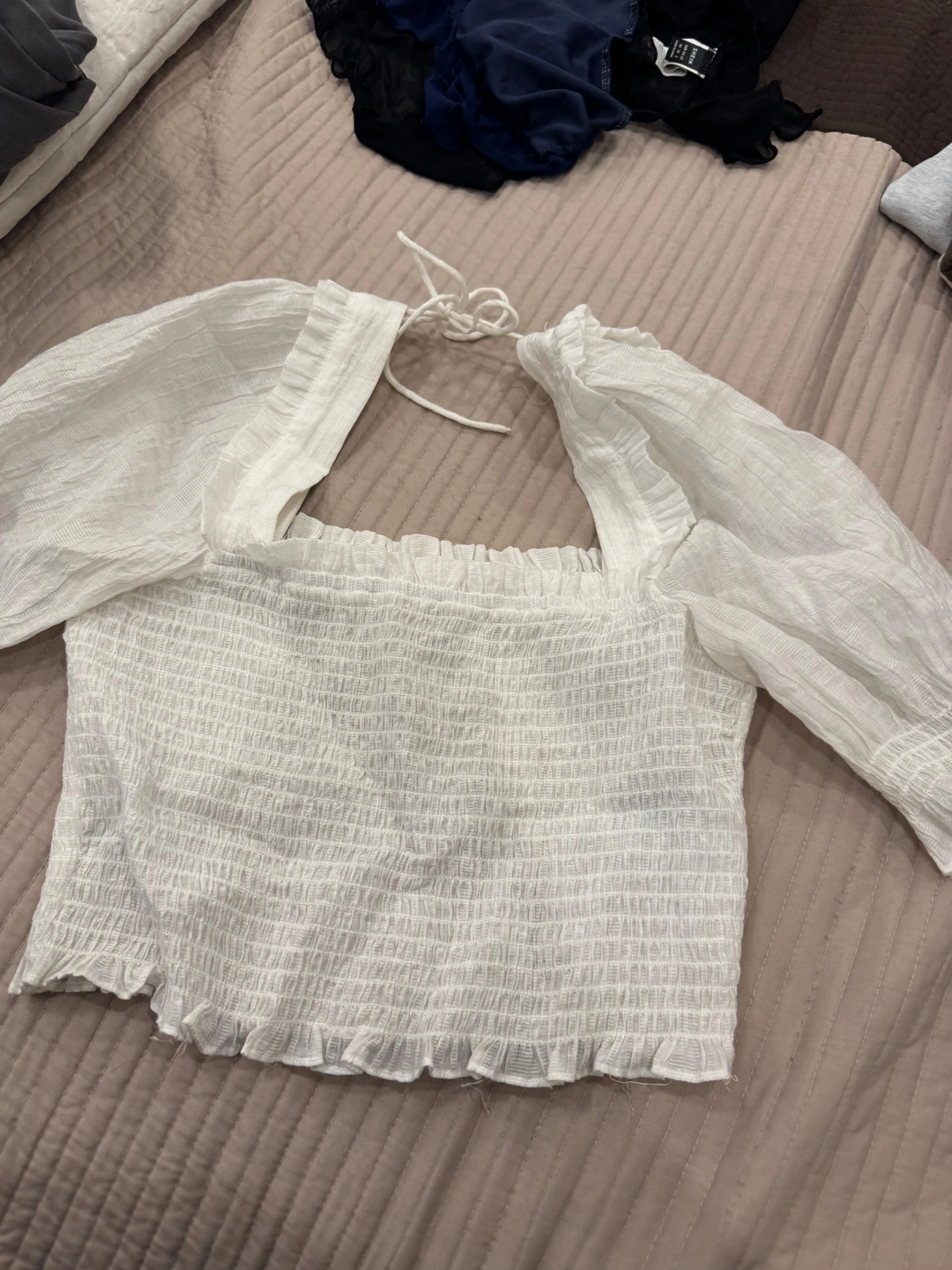 White smocked crop top with puff sleeves and a tie-back detail. Soft, lightweight fabric with stretch for a comfortable fit. Can be worn on or slightly off the shoulders.