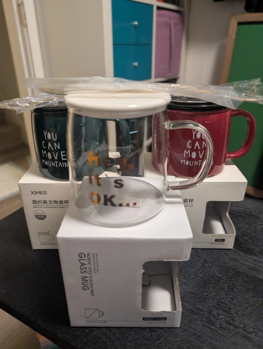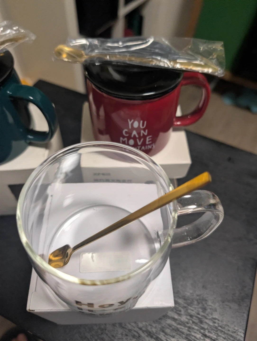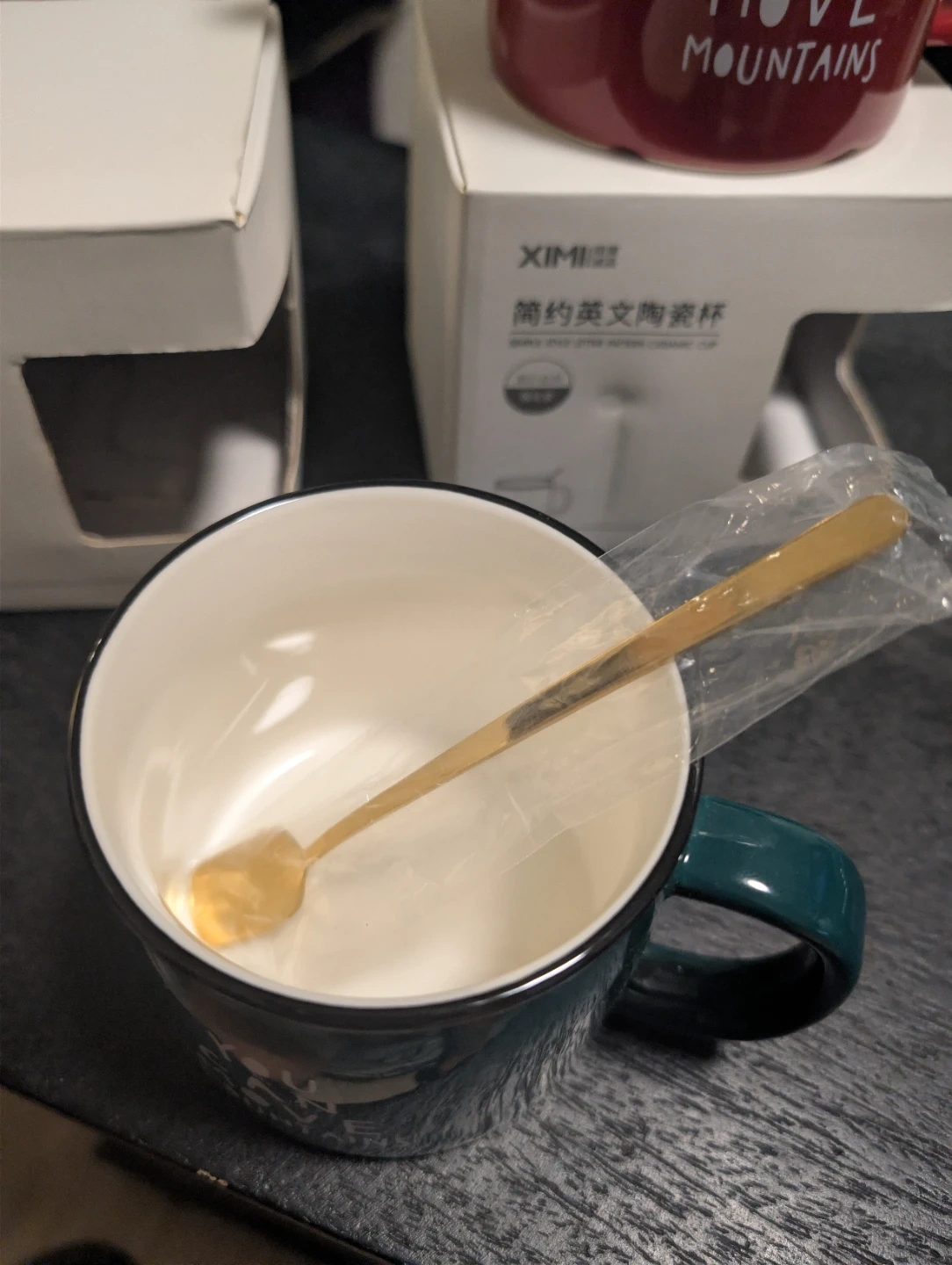 Selling a set of XIMIVOGUE Nordic Style Golden Rim glass mugs! These mugs are brand new and still in their original packaging. Each mug has a unique design and comes with a matching spoon. Perfect for adding a touch of elegance to your morning coffee or tea!
