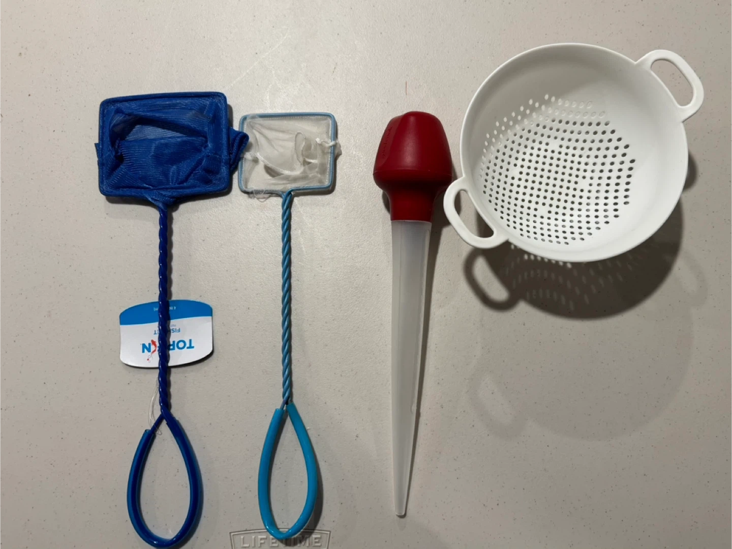 - 2 nets, turkey baster, and small colander for tank cleaning