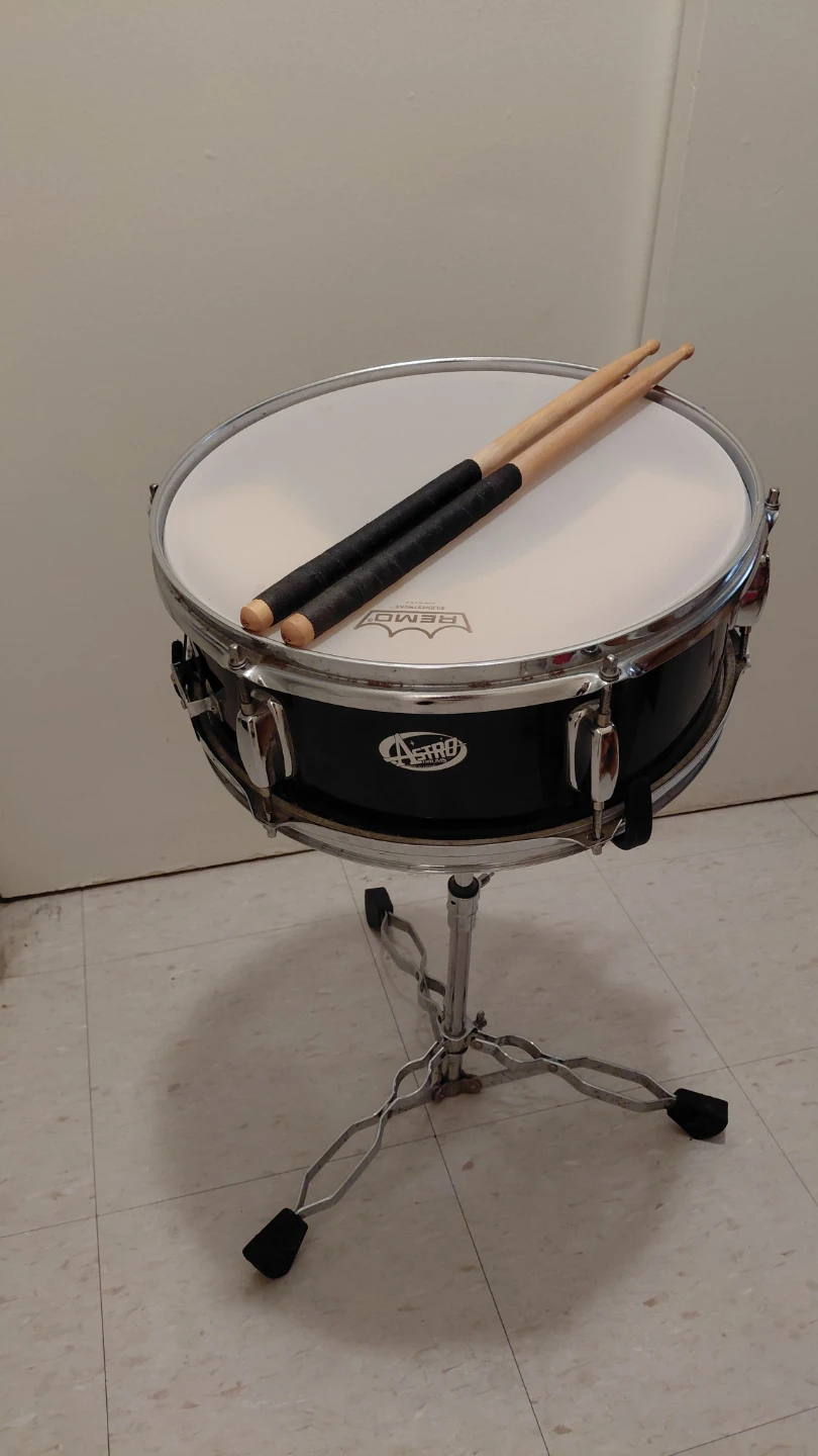 Selling a Remo Silentstroke drum head along with a vintage beginners snare drum. The drum head is designed to reduce noise, making it great for practicing at home without disturbing others. Comes with a stand and drum.