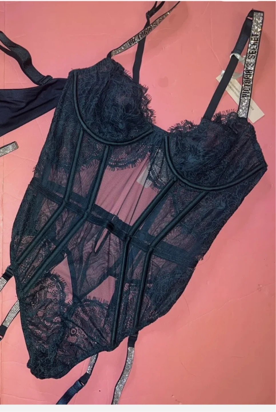 Selling a Victoria's Secret black lace bodysuit. It features lace detailing and straps with the Victoria's Secret rhinestones