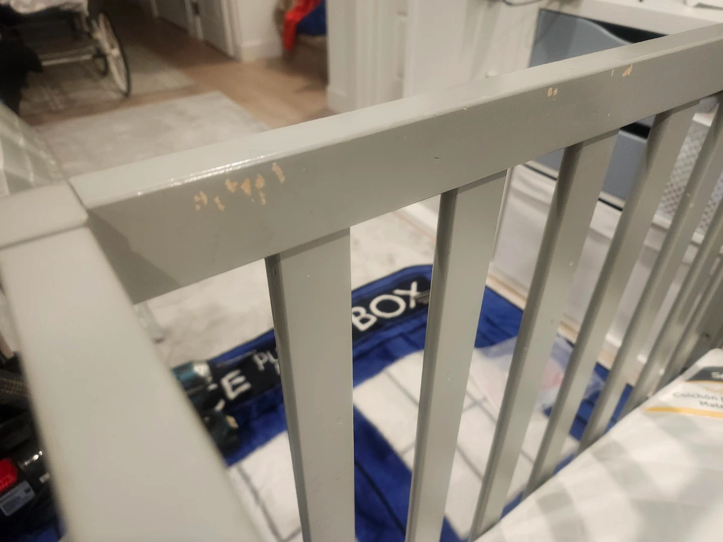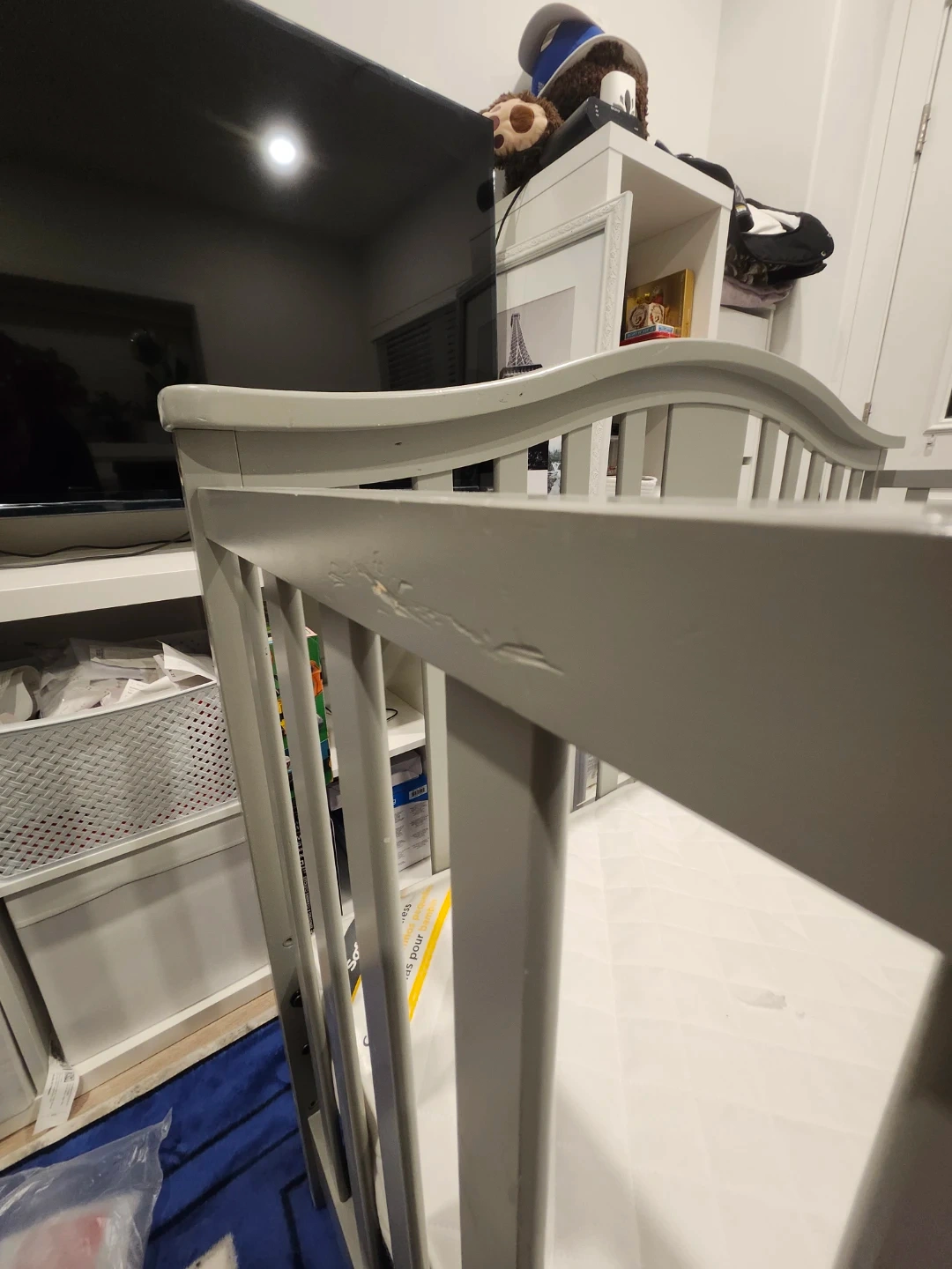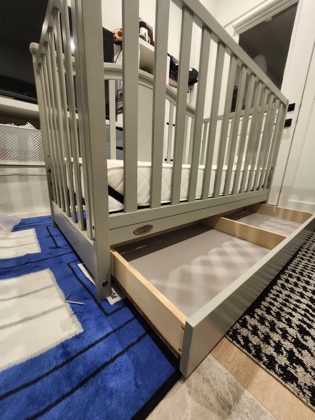 Selling a Graco crib in grey! It has some visible wear and tear, as shown in the pictures. The manufacturing date is 2019 August. It also has a drawer at the bottom for extra storage. The dimensions are in the photo.