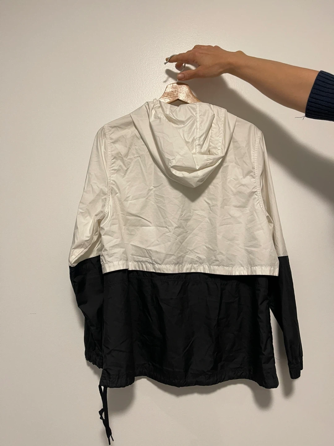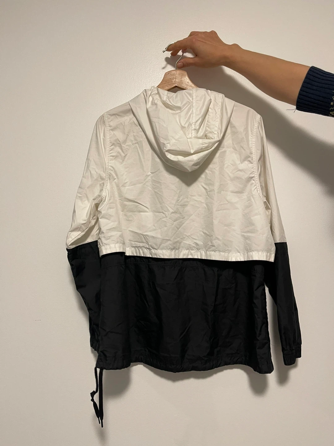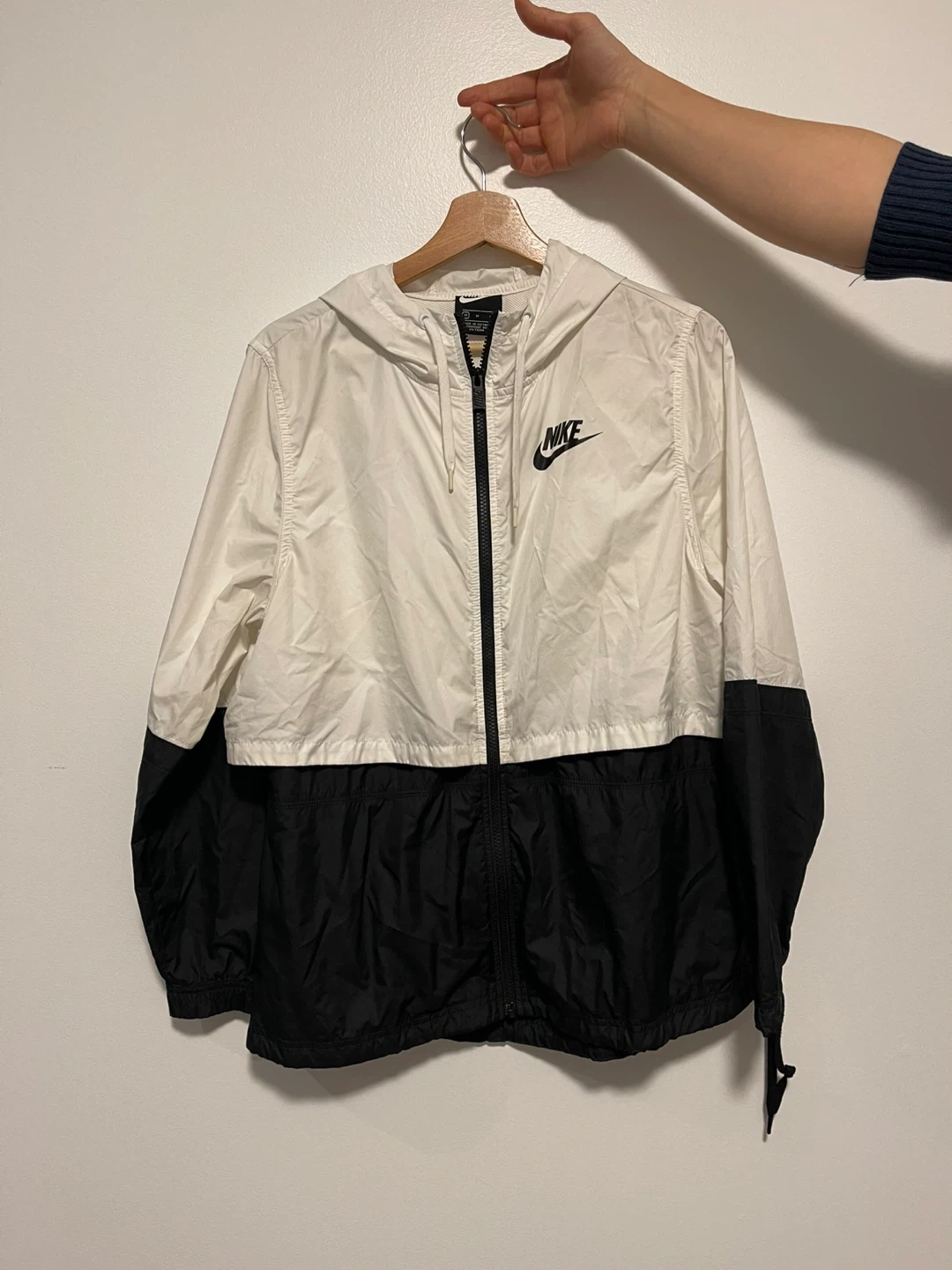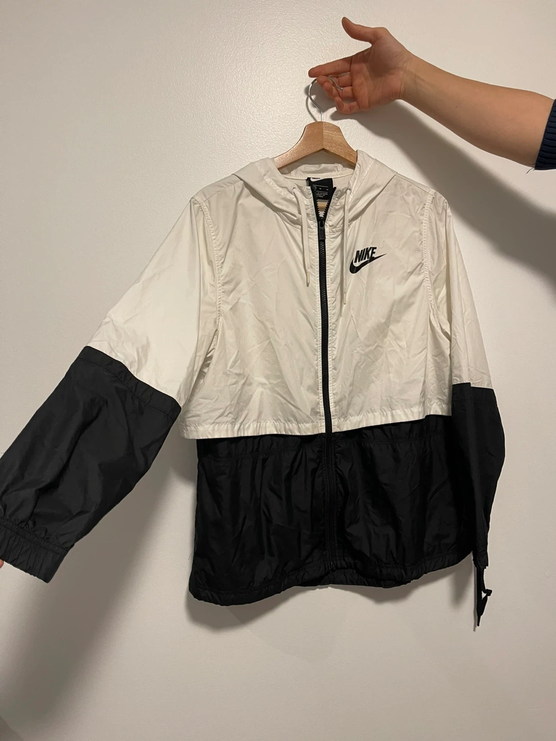Selling a Nike windbreaker jacket in a stylish white and black colour block design! It's in great condition and perfect for layering or outdoor activities. The jacket features a hood and a lightweight feel, making it super practical for everyday wear. A classic piece to add to your wardrobe