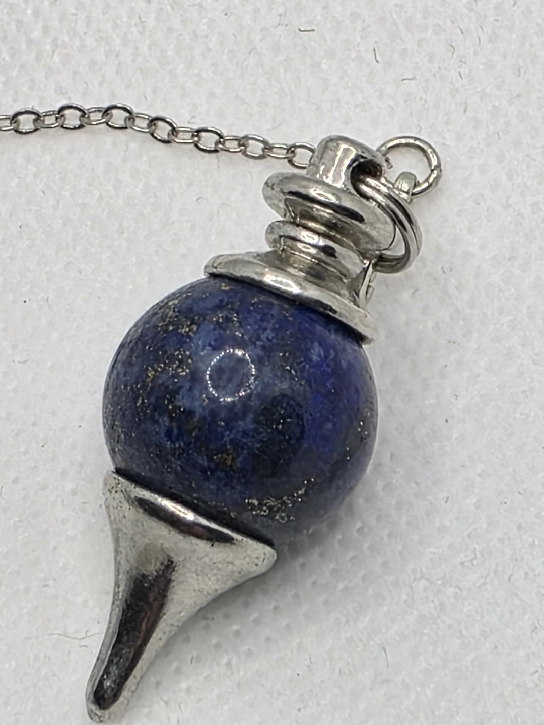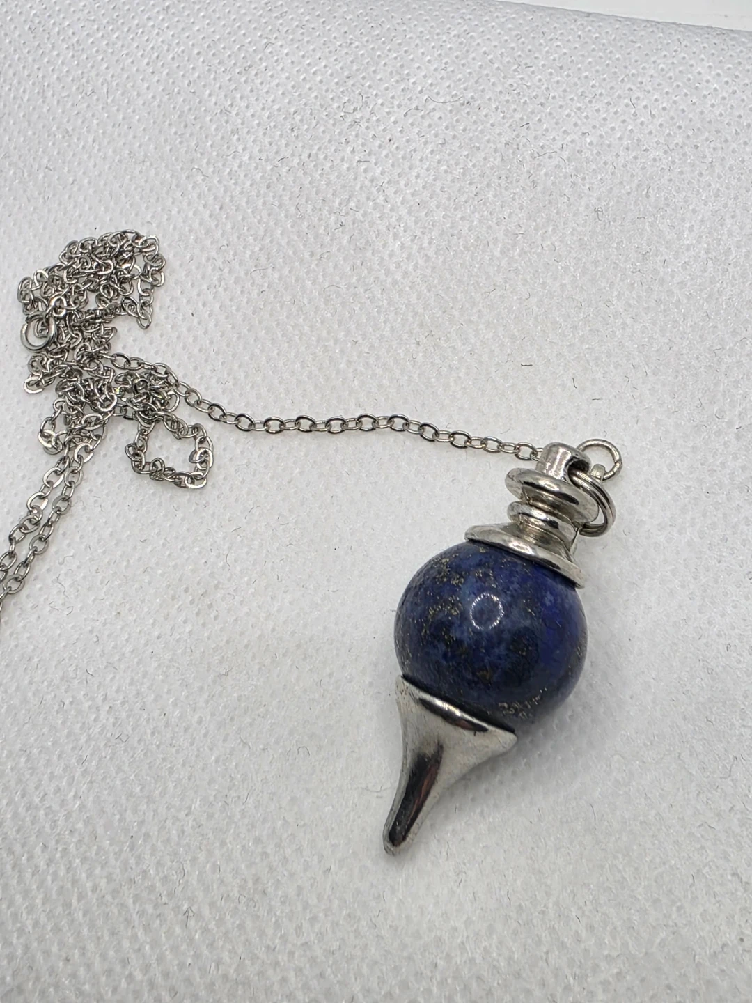 Here's a beautiful lapis lazuli pendulum with a silver chain. It's in great condition and ready for use.