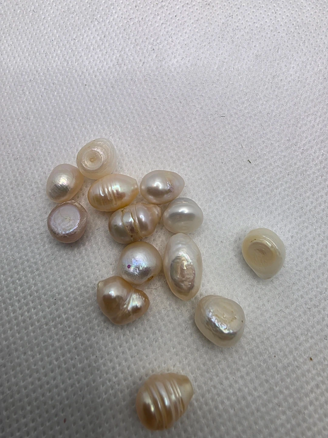 Selling a collection of freshwater pearls. They have a beautiful iridescent sheen and unique shapes. Perfect for jewelry making or crafting projects!