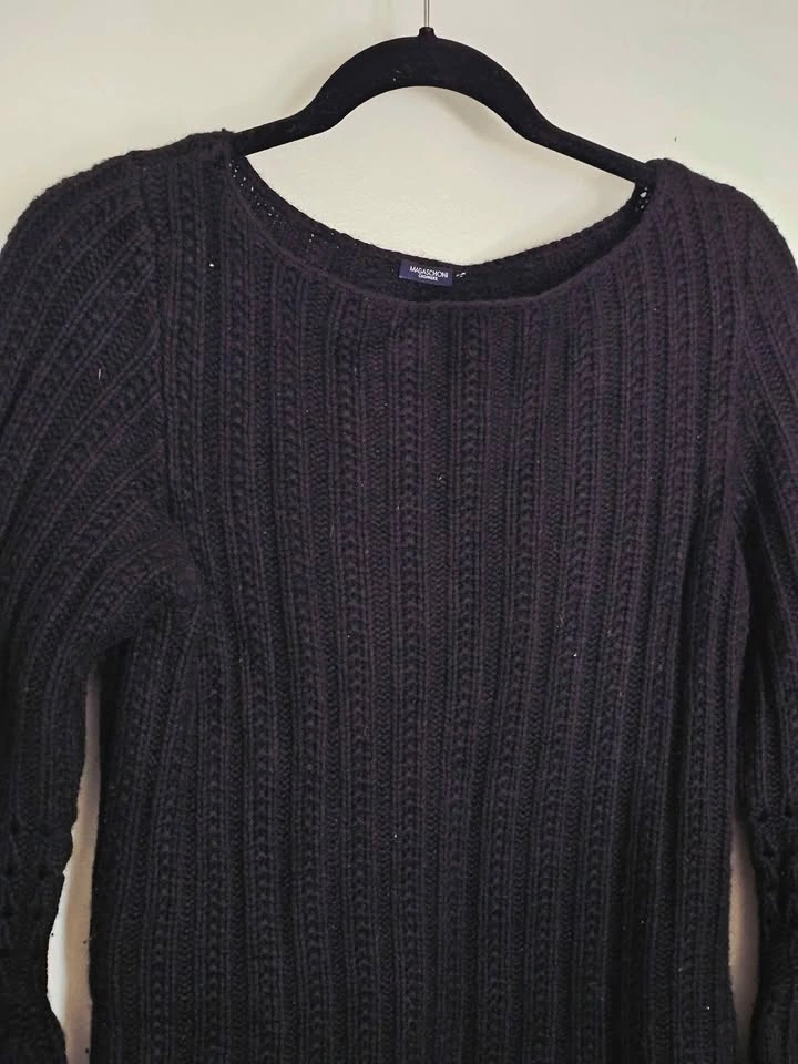 Elegant and timeless ultra soft black 100% cashmere sweater dress or tunic sweater by luxury brand Magaschoni. Designed with a vertical ribbed knit body and distinctive sculptural statement bell sleeves featuring textured, puffed detailing at the cuffs and patterned detailing at the bottom hem. Longer length makes it ideal worn as a sweater tunic layered over trousers or a mini dress - may be too short as a dress if you are tall. Sweater has a boat neckline and is a pullover style. Made for a relaxed yet refined silhouette with some witchy goth flair.