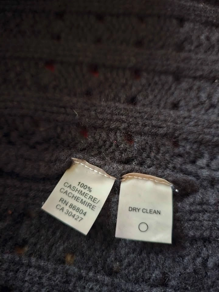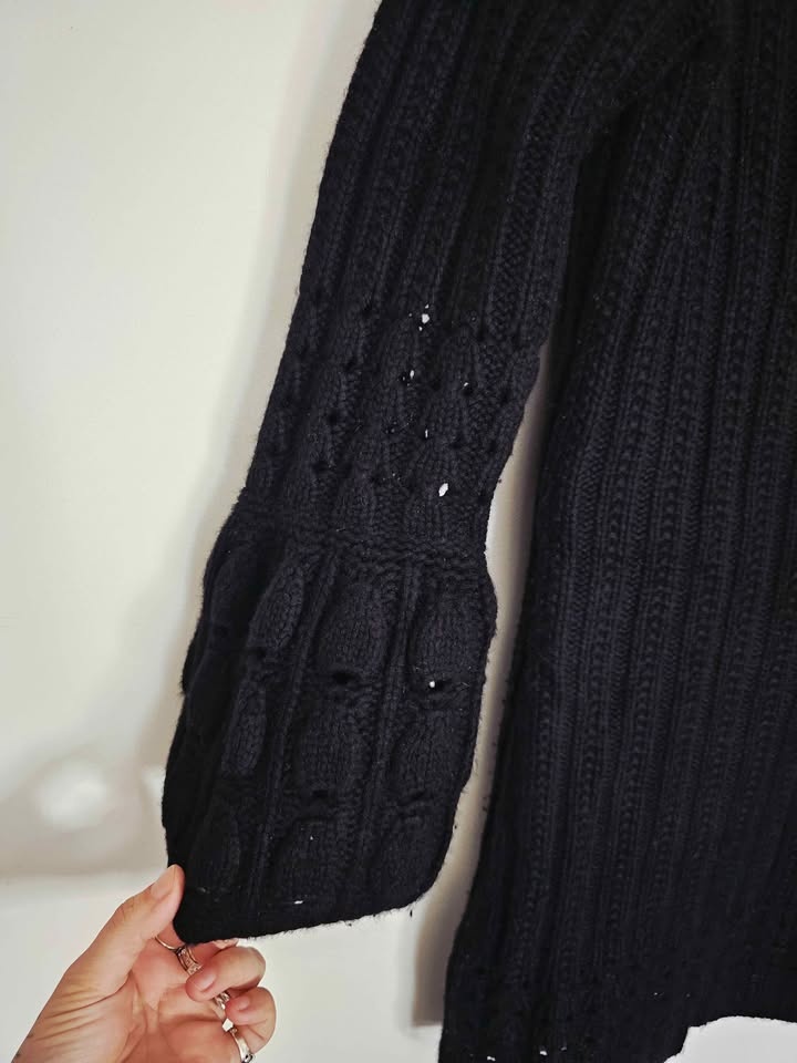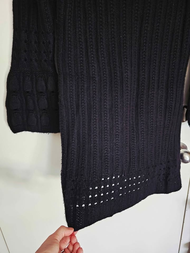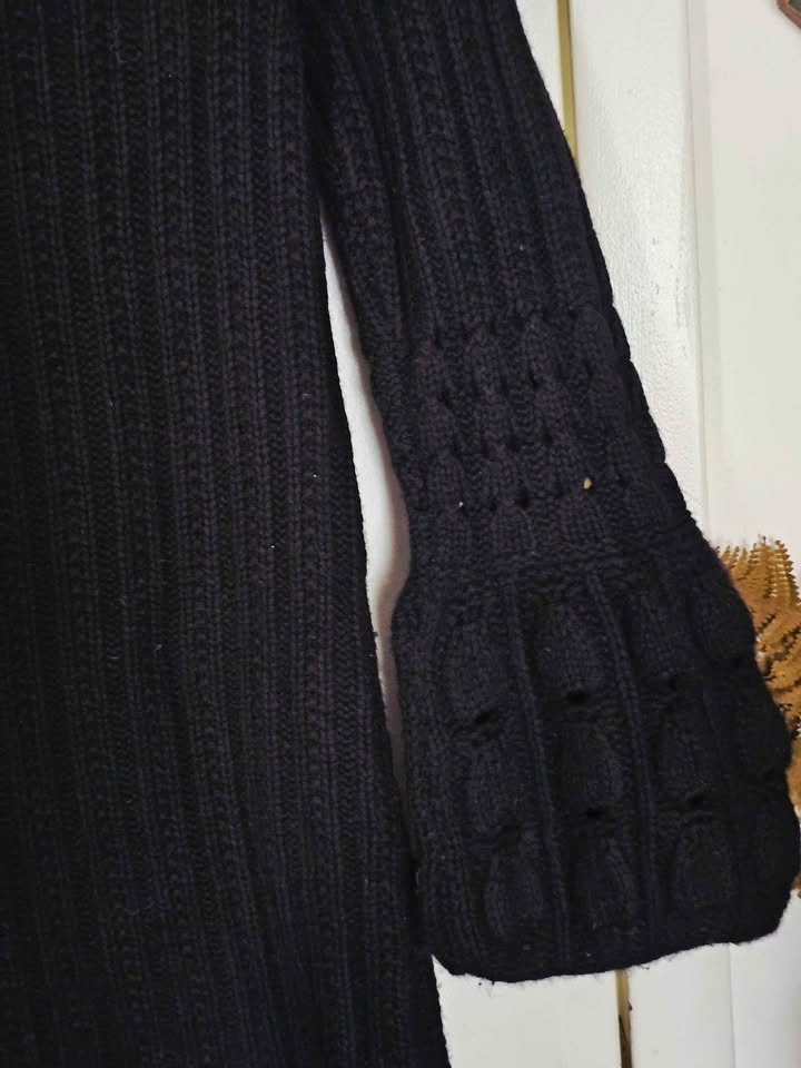 Sweater is in very good used condition with some light signs of wear. Size tag is missing, but it fits like a US size Small. Pit to pit measures about 17", waist measures about 15.25", pit to sleeve hem measures about 18", and shoulder to bottom hem measures about 32". All measurements are taken unstretched and it has quite a bit of stretch to it.
