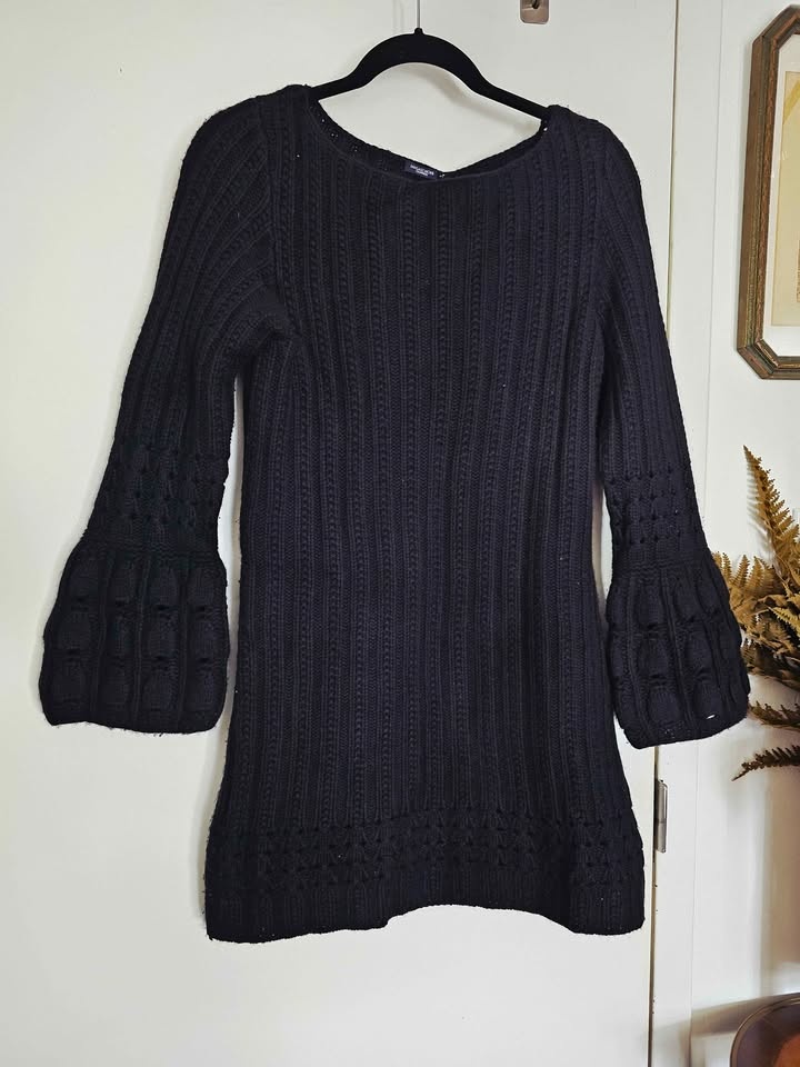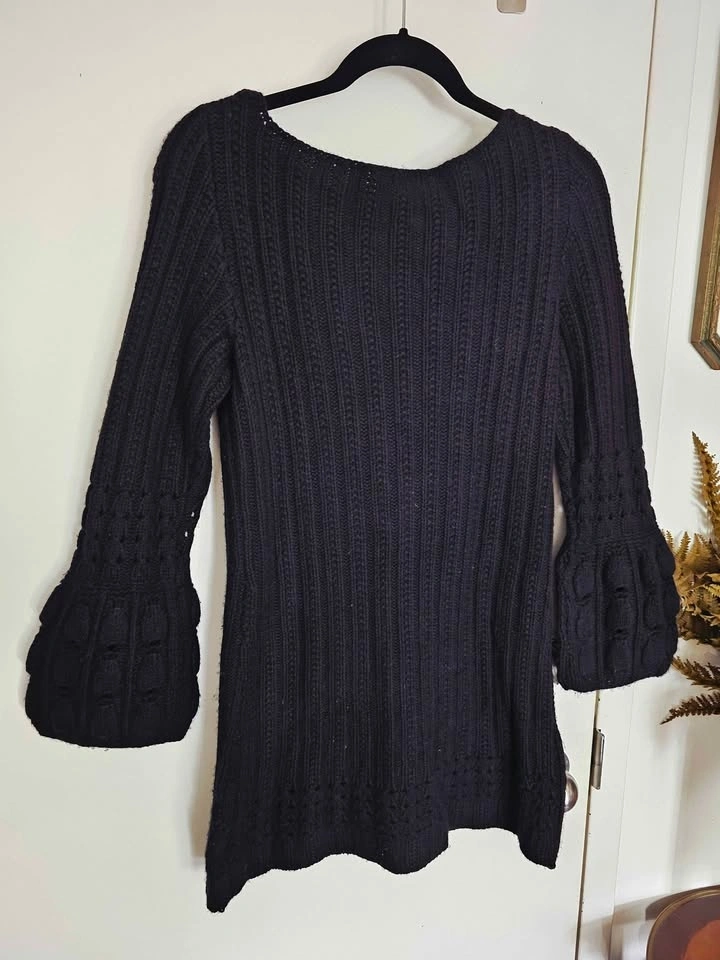 Elegant and timeless ultra soft black 100% cashmere sweater dress or tunic sweater by luxury brand Magaschoni. Designed with a vertical ribbed knit body and distinctive sculptural statement bell sleeves featuring textured, puffed detailing at the cuffs and patterned detailing at the bottom hem. Longer length makes it ideal worn as a sweater tunic layered over trousers or a mini dress - may be too short as a dress if you are tall. Sweater has a boat neckline and is a pullover style. Made for a relaxed yet refined silhouette with some witchy goth flair.